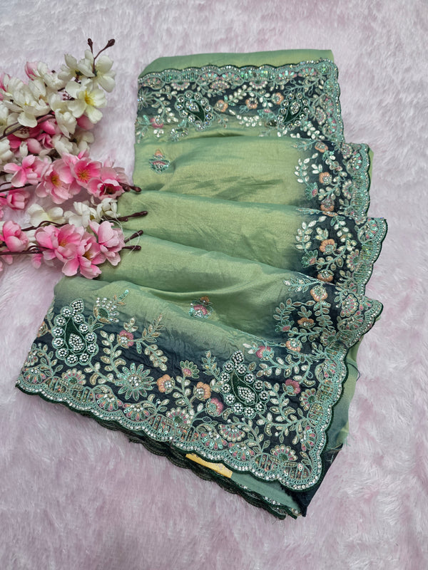 • Mehndi Saree: Mehndi saree is perfect for celebration. Choose bright colours and floral patterns that fit the event. A fashionable saree appearance that will highlight you when celebrating with friends and family.