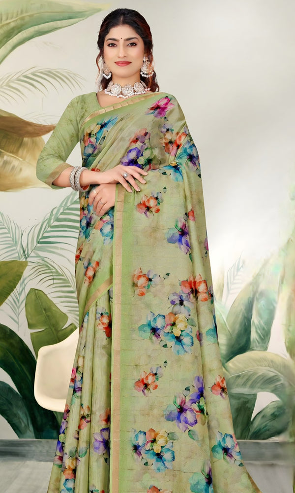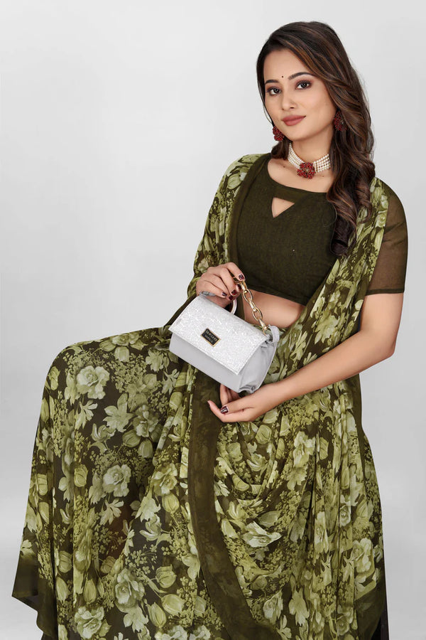 • Mehndi Saree: Mehndi saree is perfect for celebration. Choose bright colours and floral patterns that fit the event. A fashionable saree appearance that will highlight you when celebrating with friends and family.