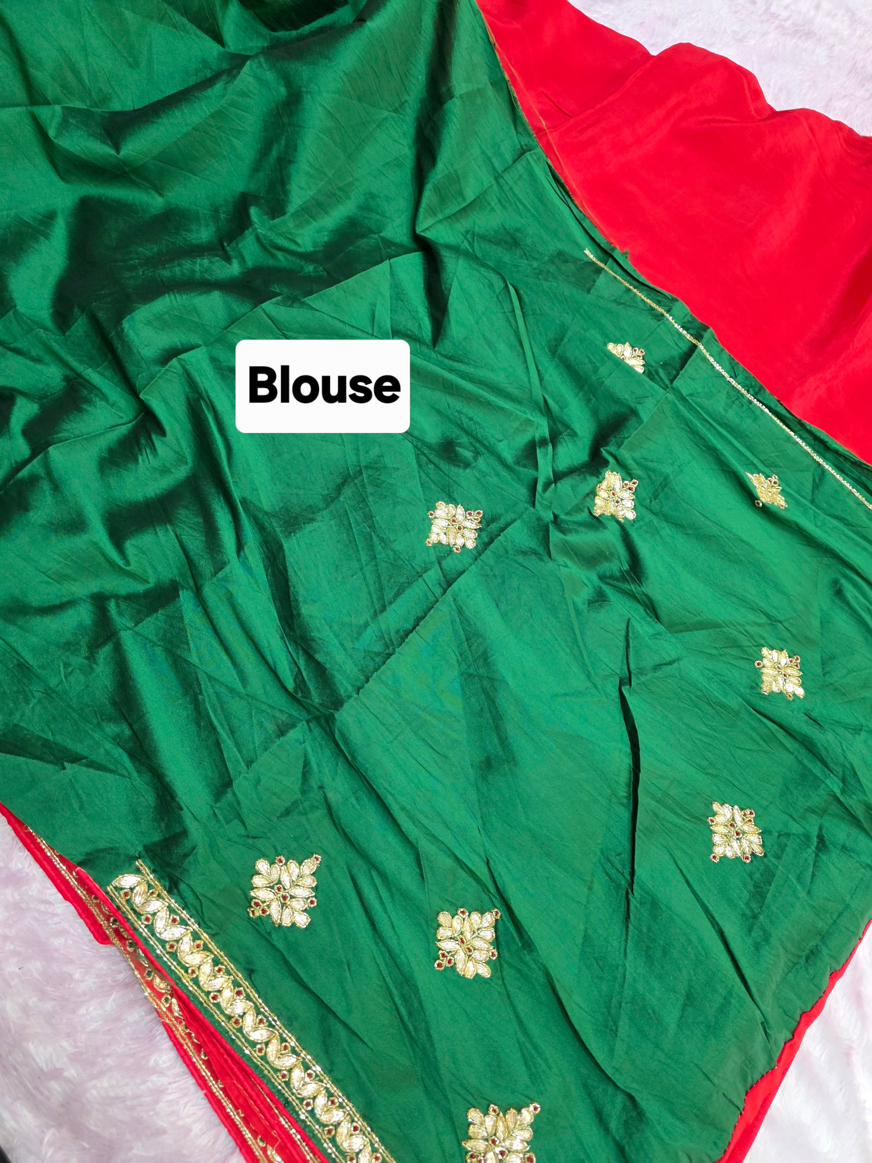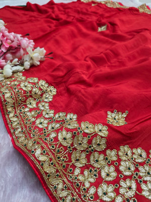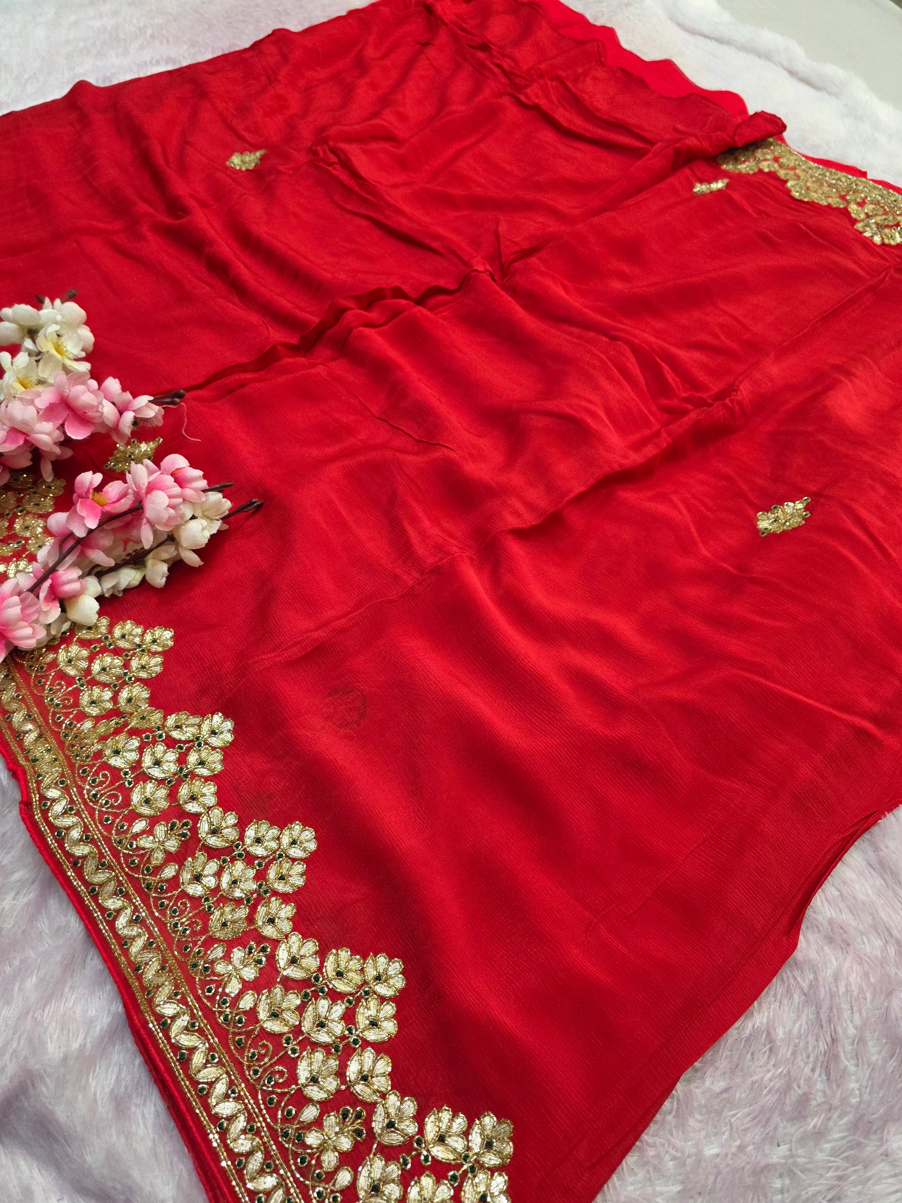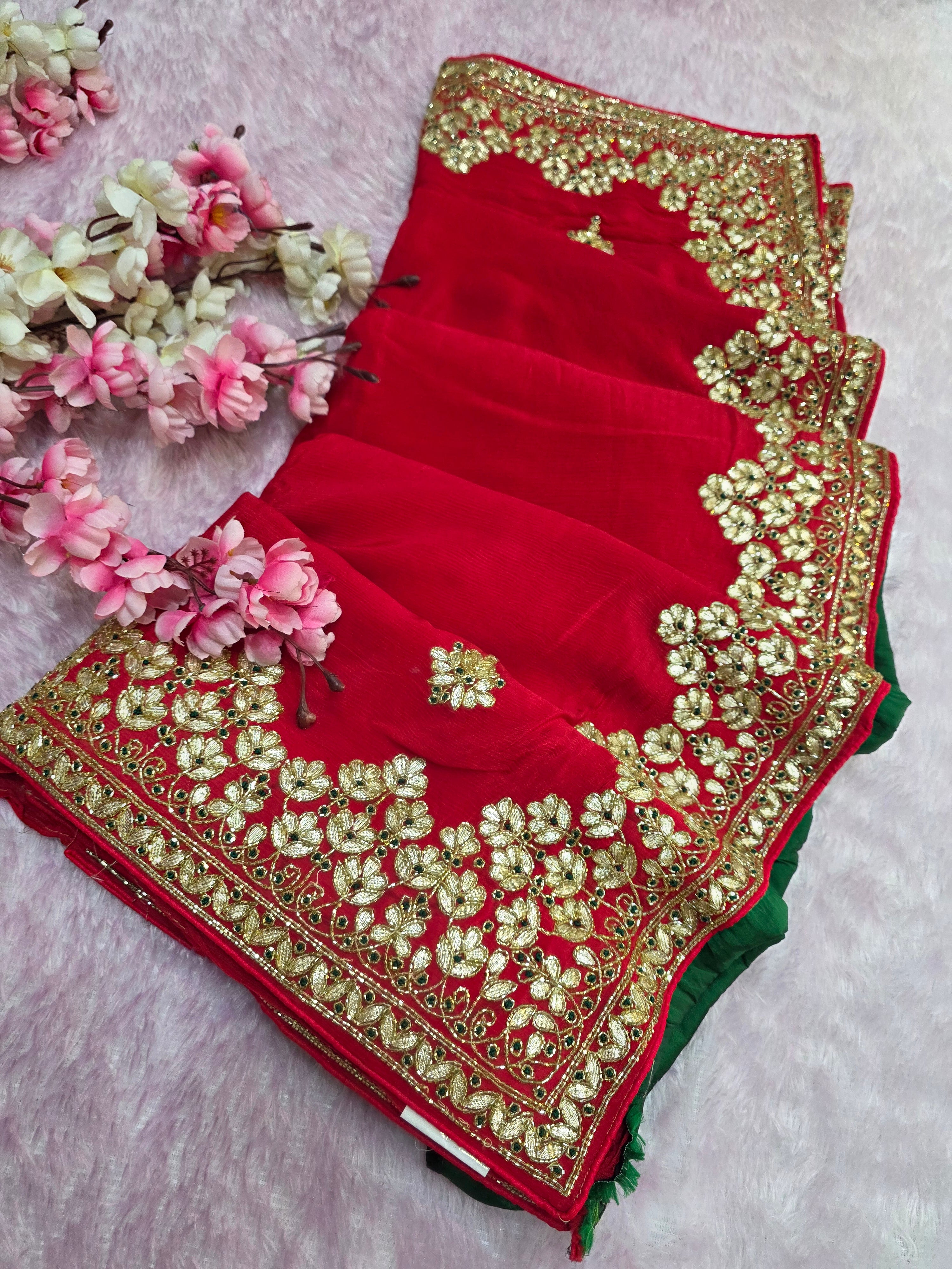 06443 Designer Pure Chinon Silk Traditional Rajasthani Saree with Hand Gotapatti Work Red Saree