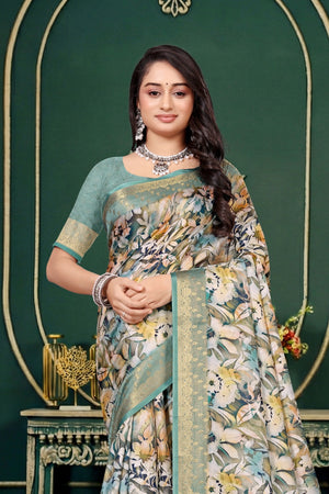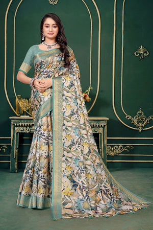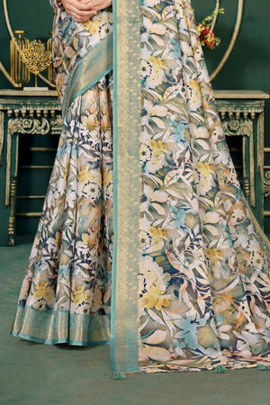 The saree features stylish floral prints combined with a finely crafted zari weaving border. The contrast of soft prints and rich border detailing creates a sophisticated and eye-catching look.