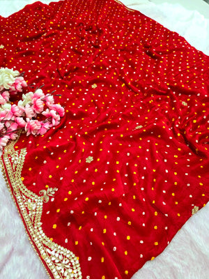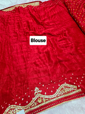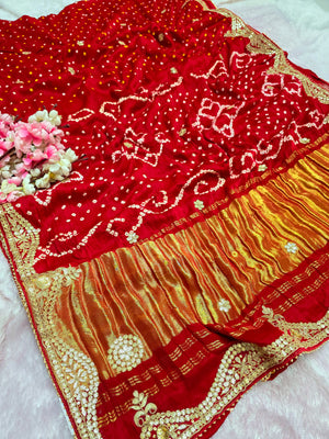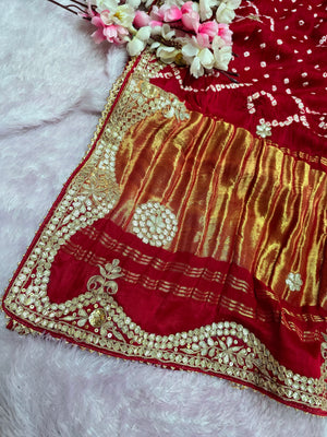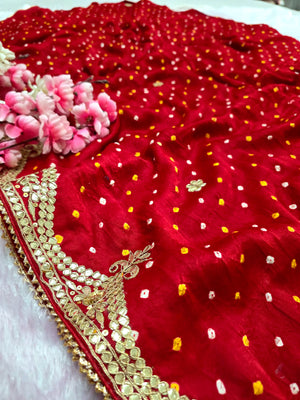 12446 New Handcrafted Gaji Silk Saree in Bandhani Style with Gota Patti Work