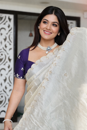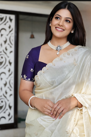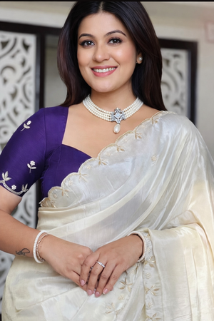 Elevate your ethnic style with this Designer Pure H.O. Silk off white saree, beautifully adorned with intricate Zardosi and Gota Patti work, paired with a stunning purple blouse. This elegant combination creates a rich contrast, perfect for women who love a graceful yet standout look for special occasions.