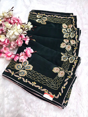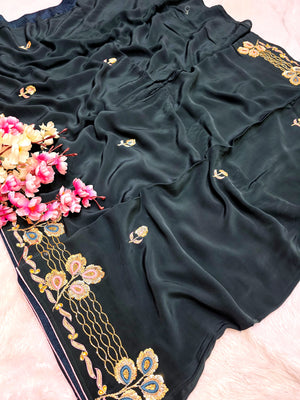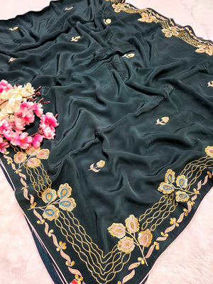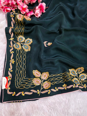 142002 कटदाना और ज़रदोज़ी वर्क वाली अनोखी गहरे हरे रंग की डिज़ाइनर साड़ी