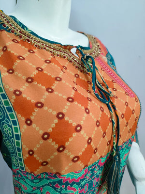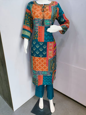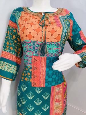 - हाइलाइट: स्ट्रेट फिट कुर्ता, पूरे शरीर पर रंगीन प्रिंट, पुष्प हाथ कढ़ाई योक