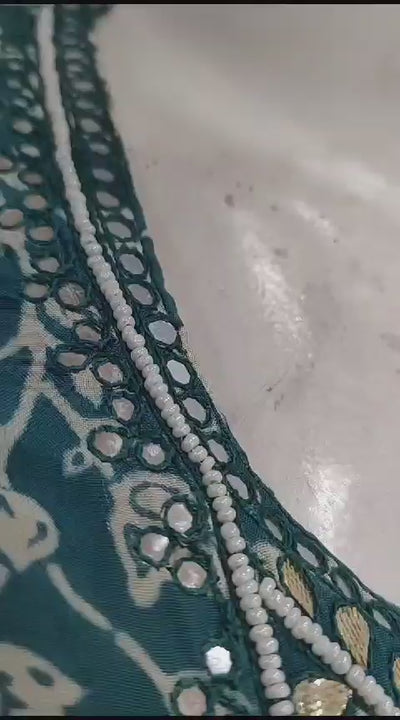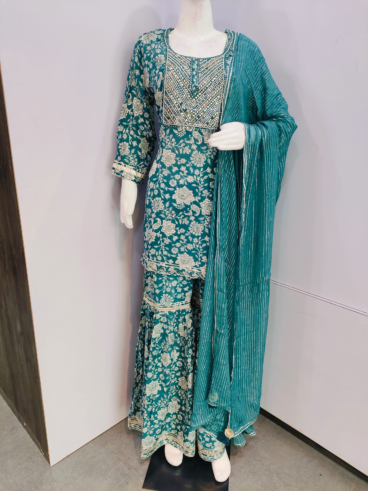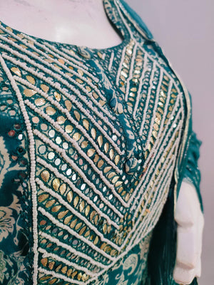 • हाइलाइट: पार्टी वियर सरारा कुर्ती और हस्तनिर्मित मोती के साथ, शुद्ध दुपट्टा के साथ नाके क्षेत्र पर गोट्टा वर्क