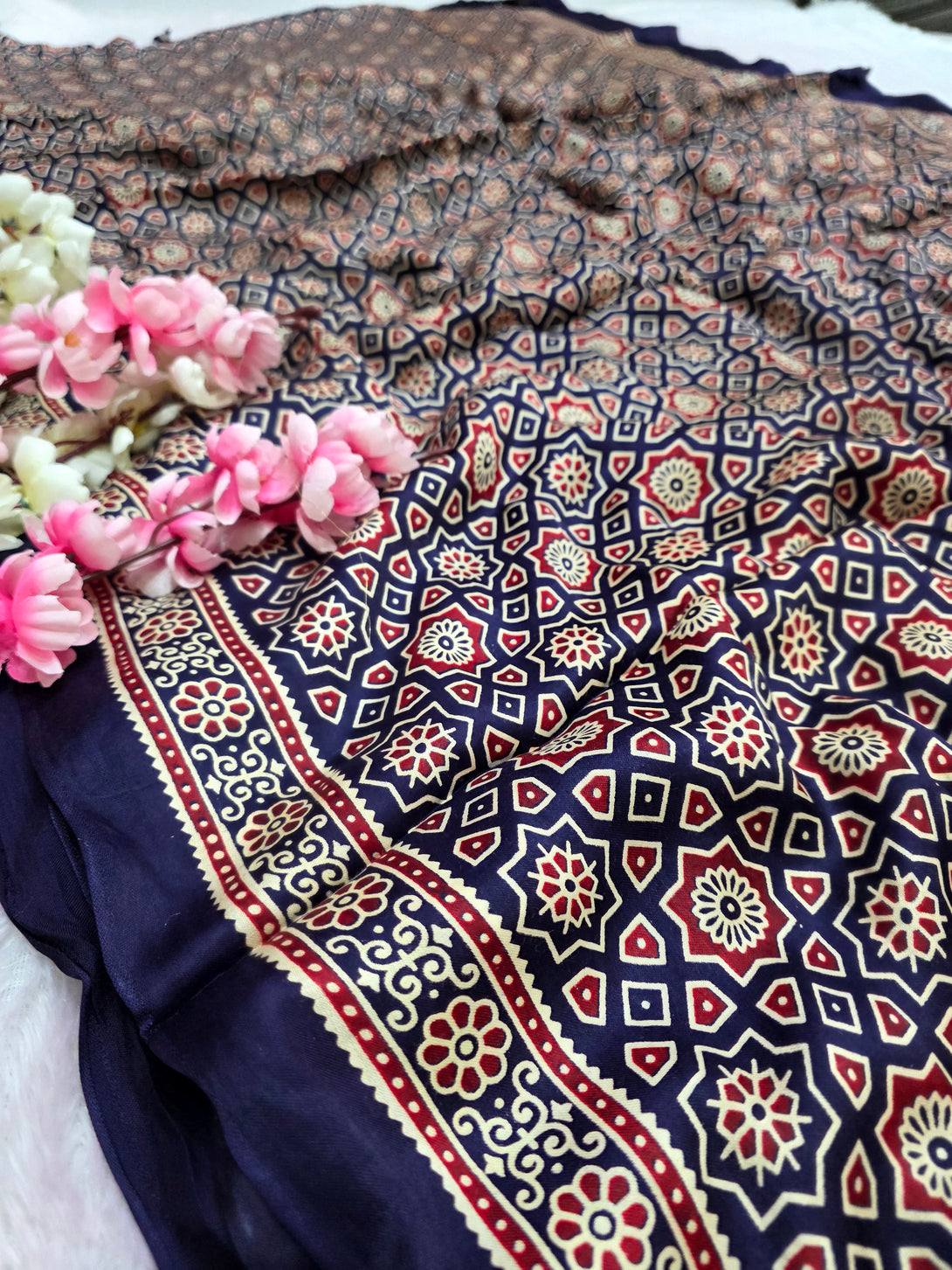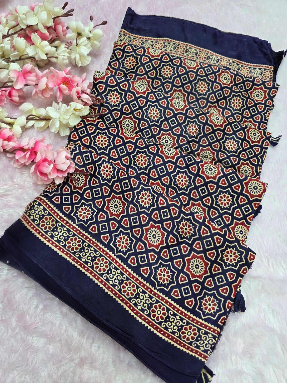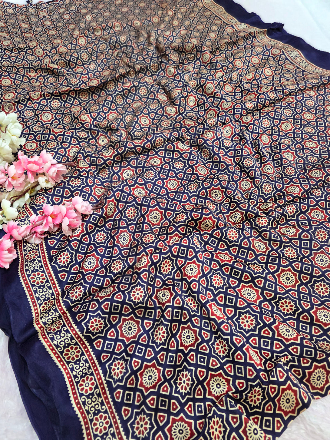 682002 ट्रेंडिंग अजरख प्रिंट इटैलियन क्रेप सिल्क साड़ी
