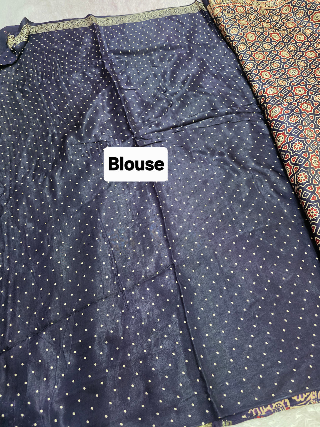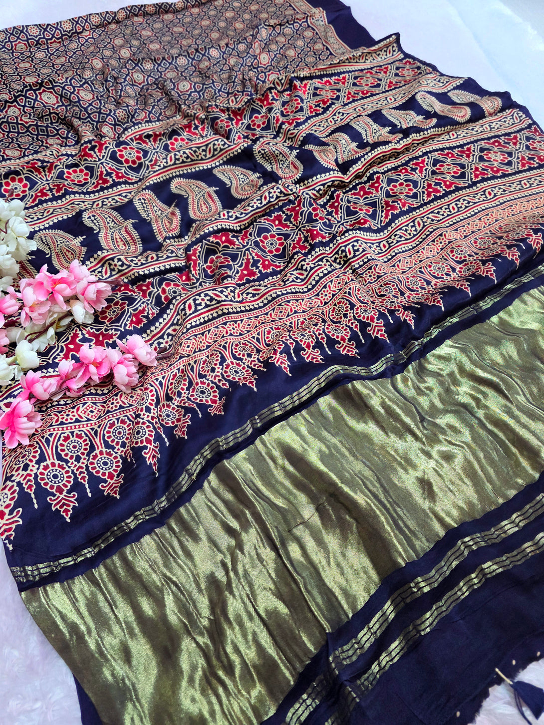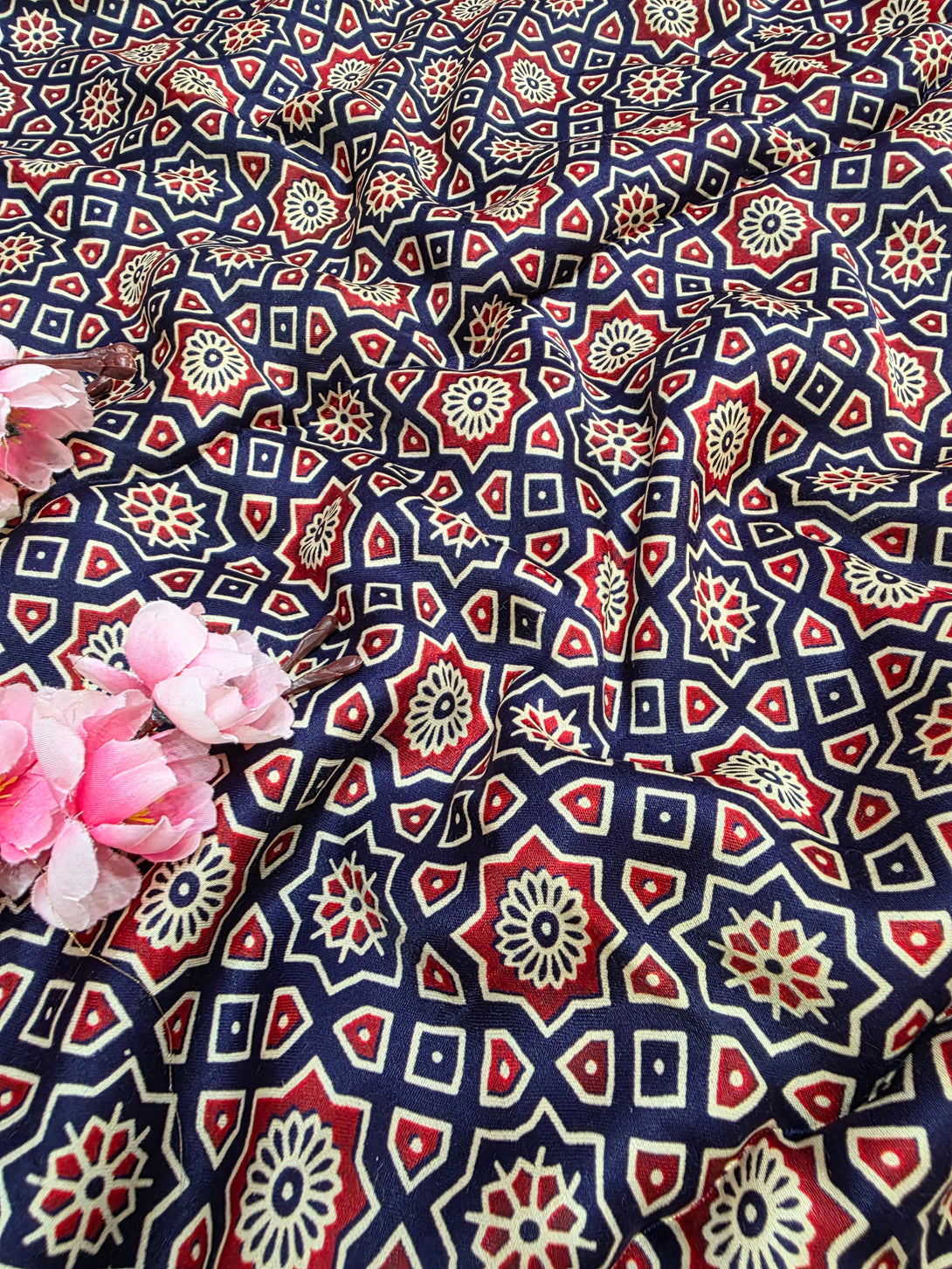 682002 ट्रेंडिंग अजरख प्रिंट इटैलियन क्रेप सिल्क साड़ी