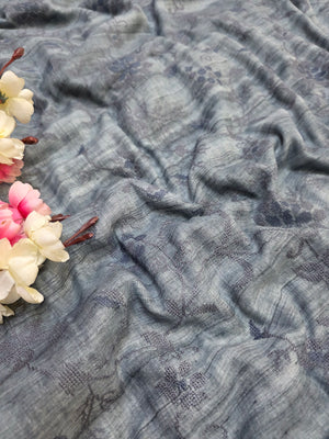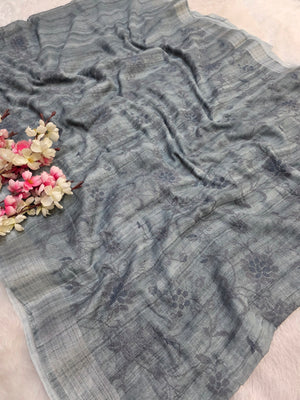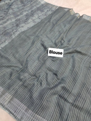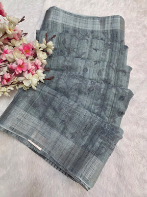 423003 सफ़ेद ज़री बुनाई बॉर्डर के साथ कढ़ाई वाली शुद्ध लिनन साड़ी
