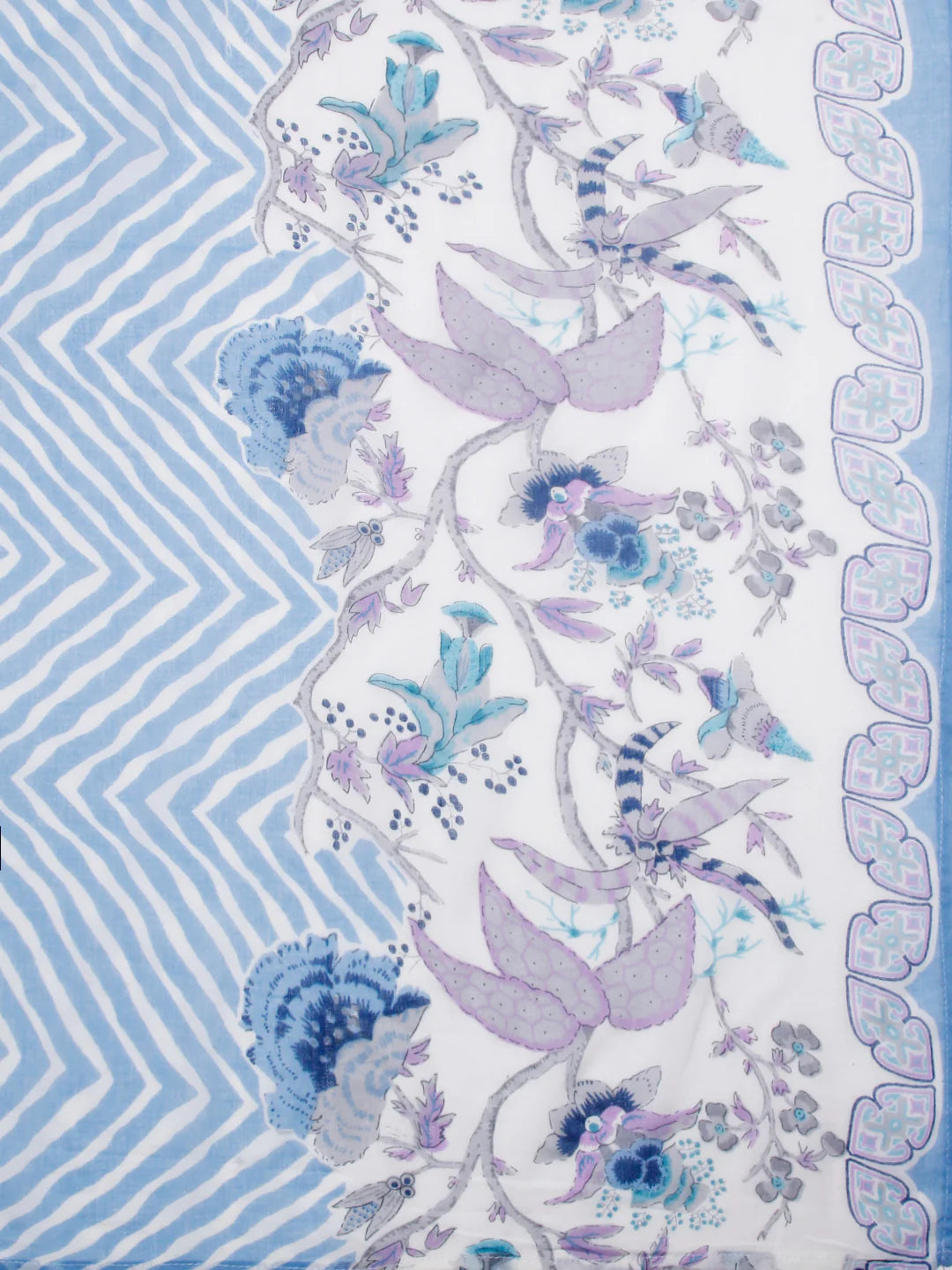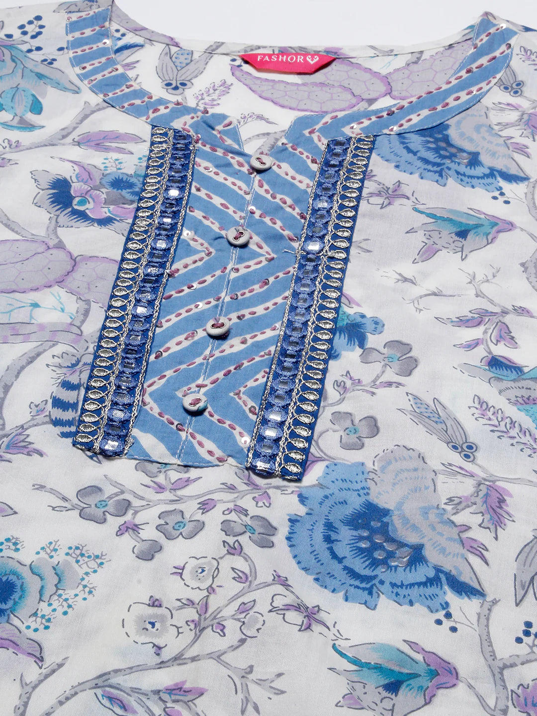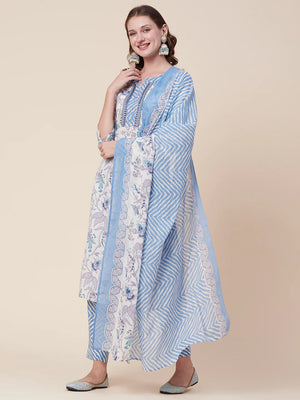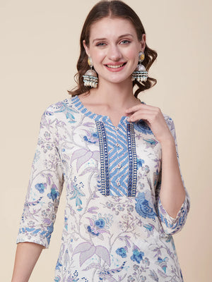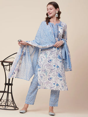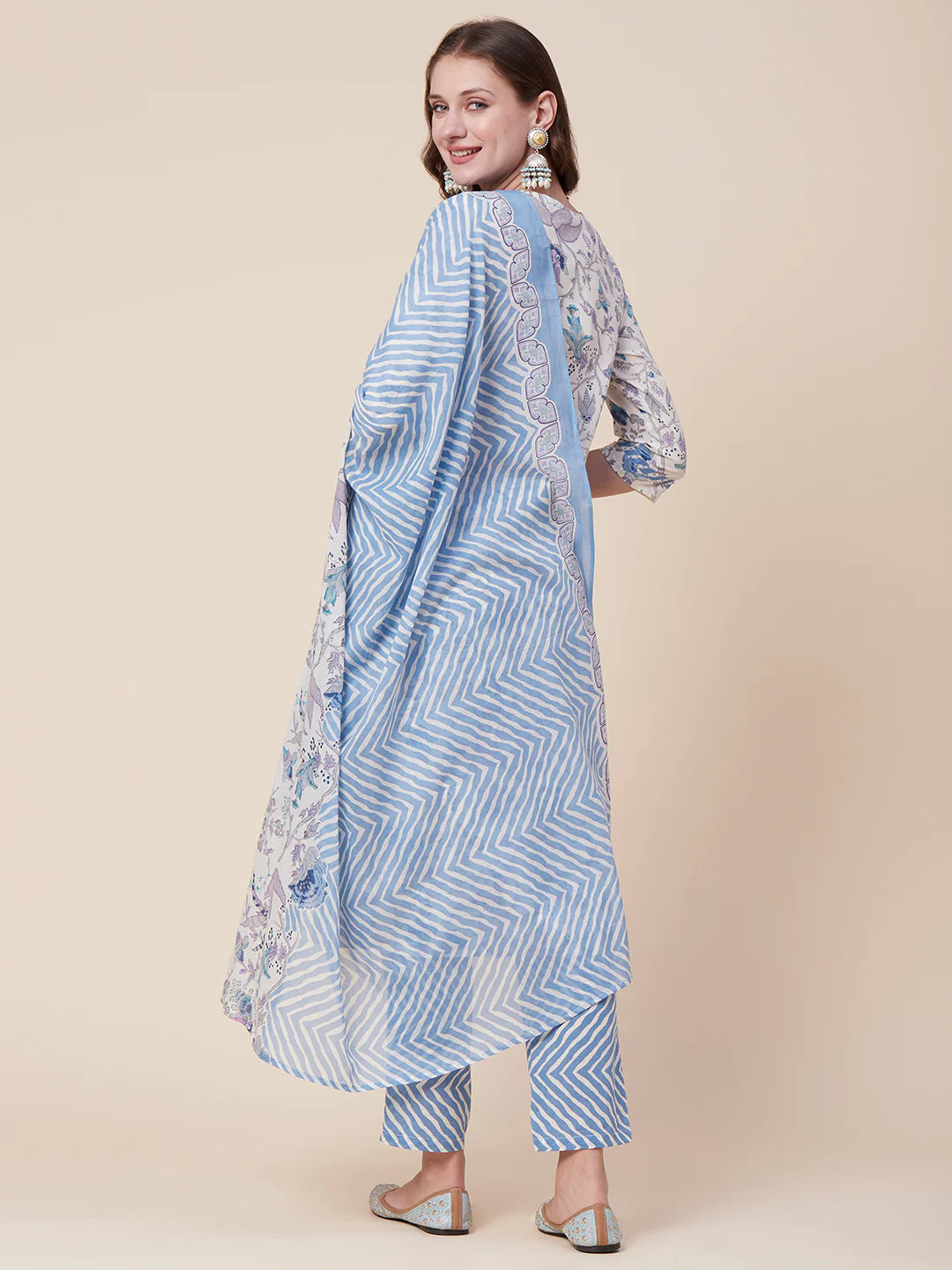 457010 फ्लोरल प्रिंटेड मिरर और ज़री कढ़ाई वाला कुर्ता शेवरॉन पैंट और दुपट्टे के साथ