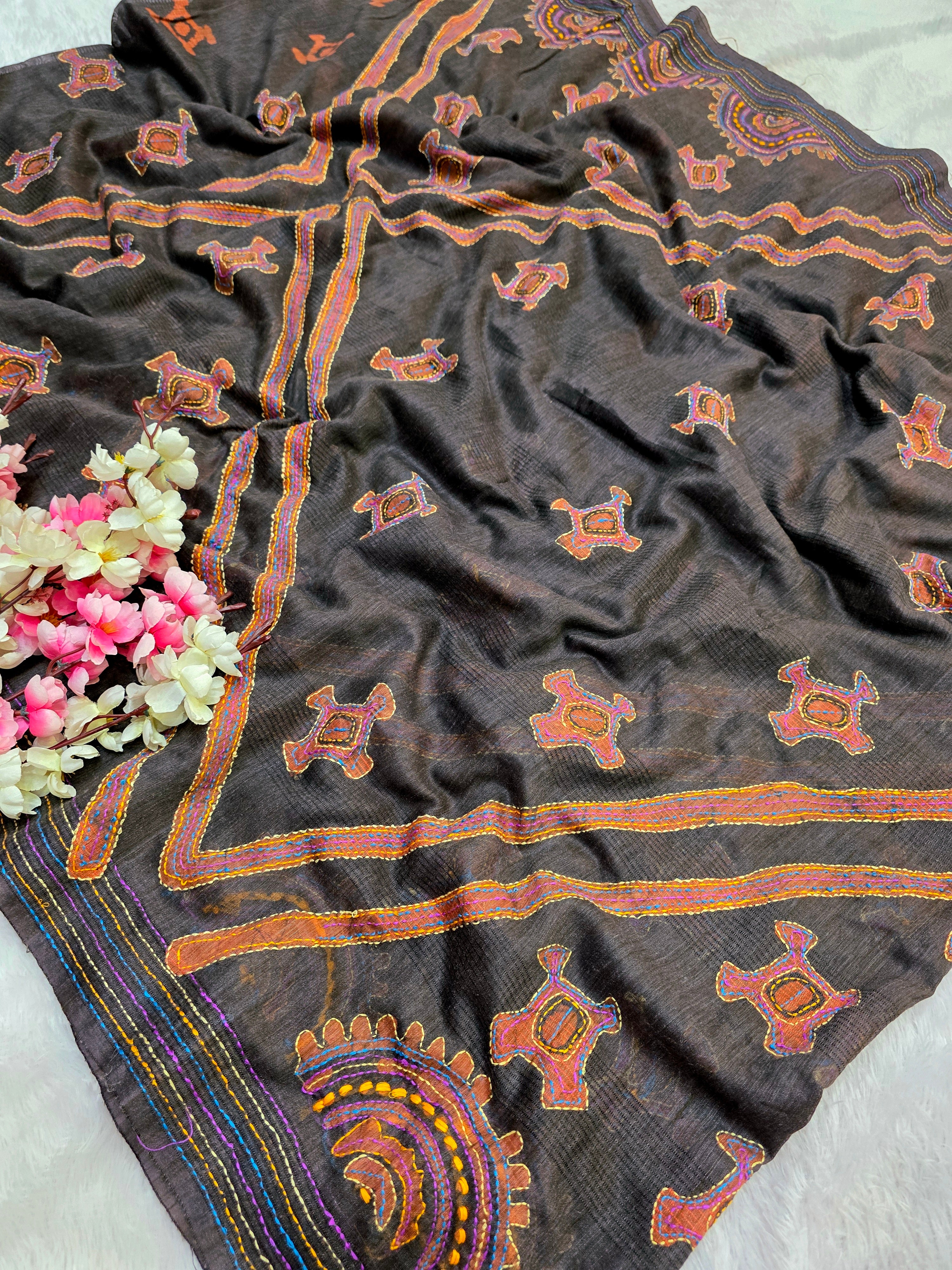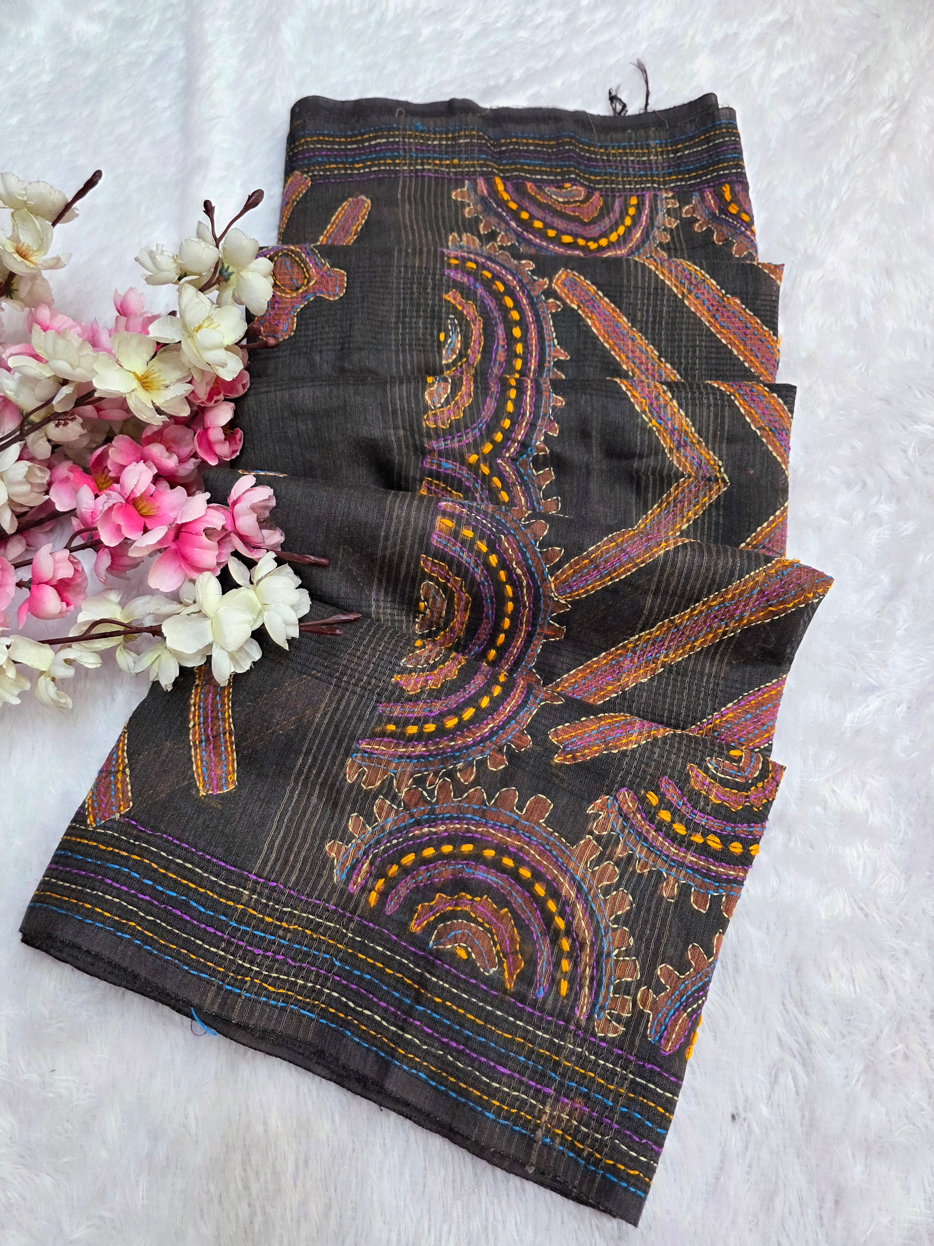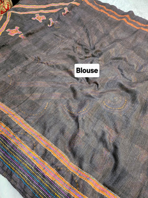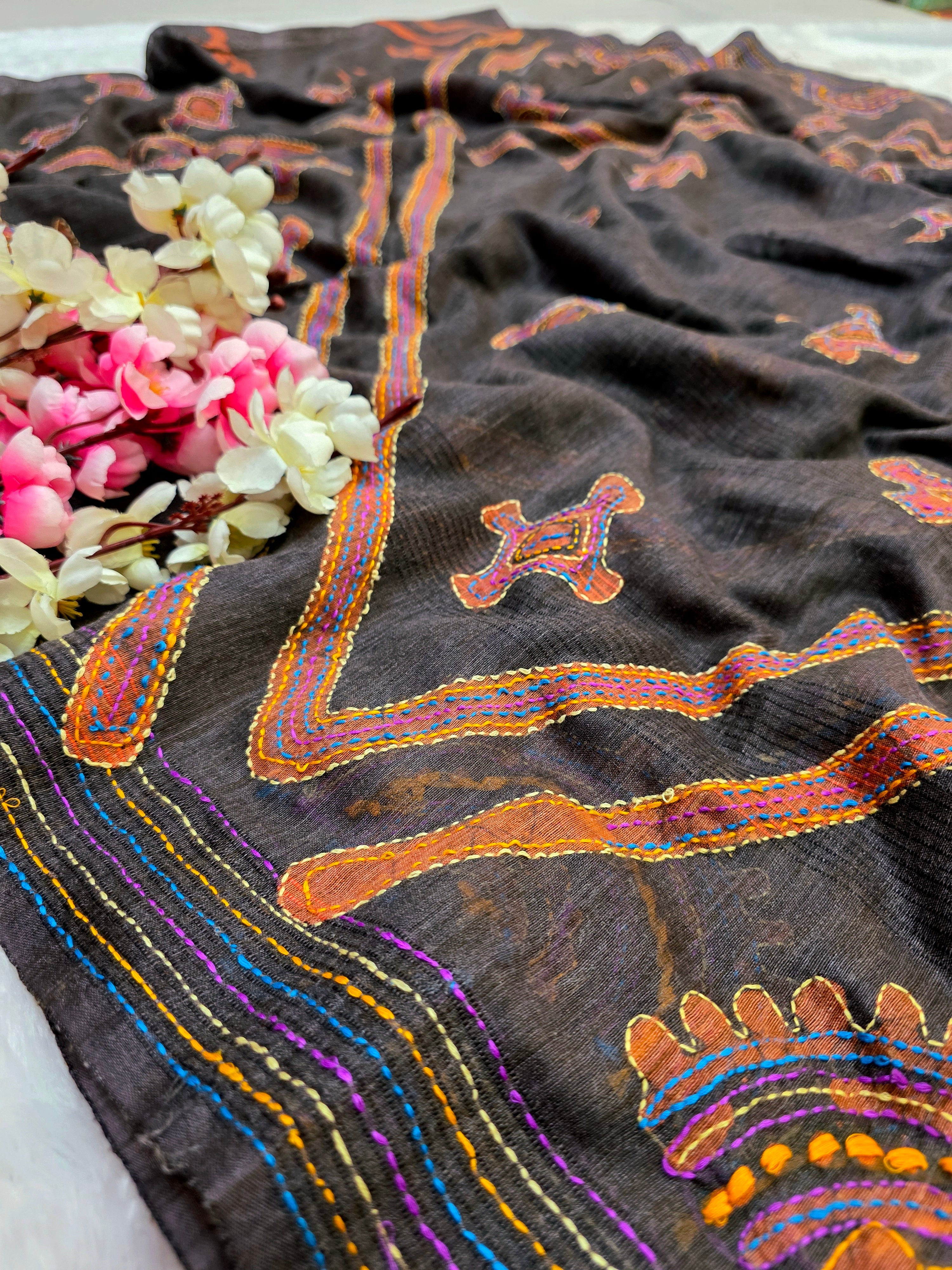 461006 शुद्ध लिनन डिजिटल प्रिंट साड़ी हाथ की कढ़ाई के साथ