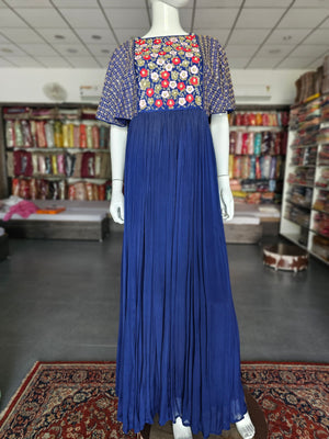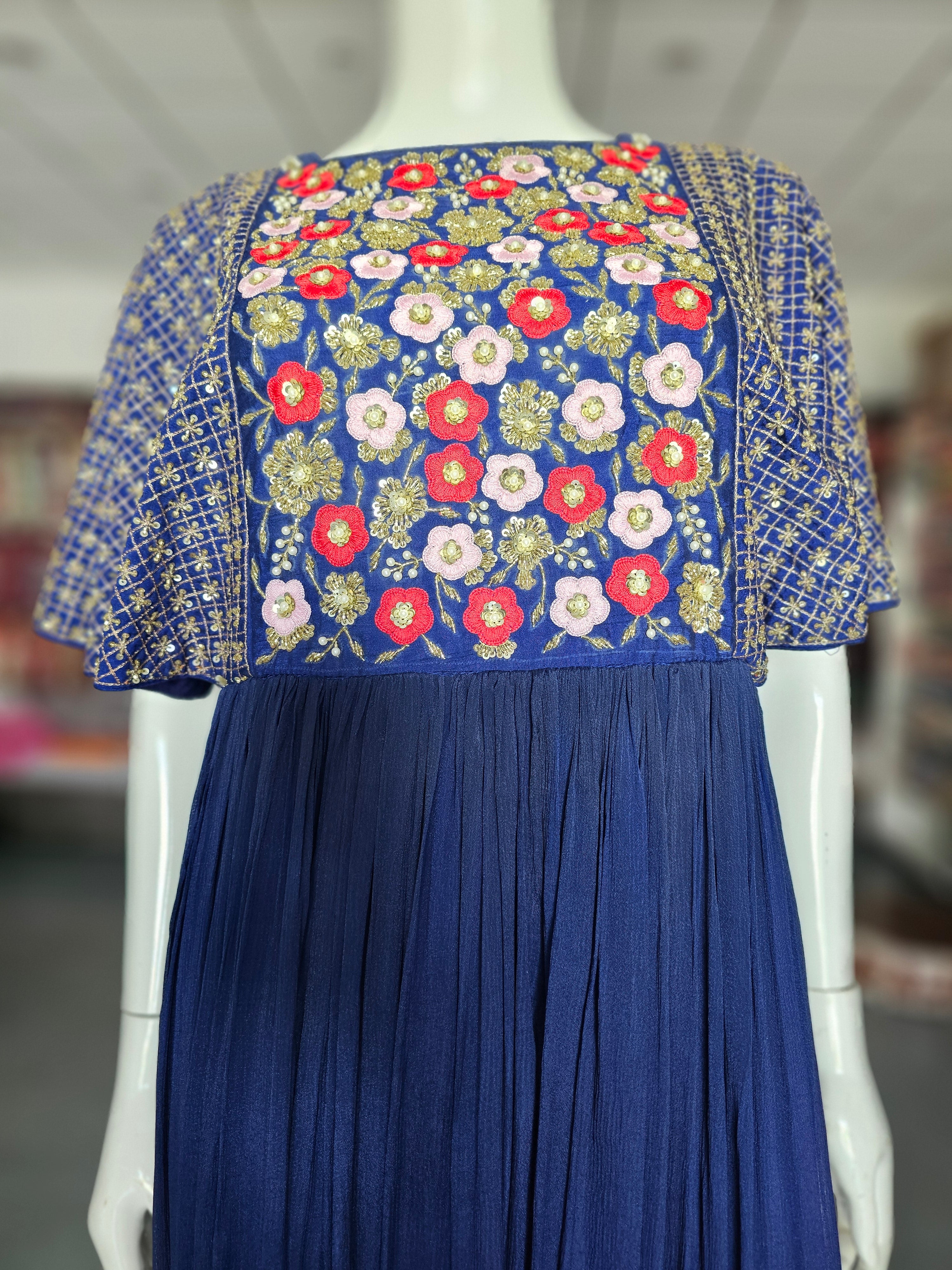 - प्रमुखता से दिखाना : प्रीमियम चिनॉन सिल्क प्रिंटेड गाउन गर्दन और भारी बेल्ट पर कटदाना काम के साथ