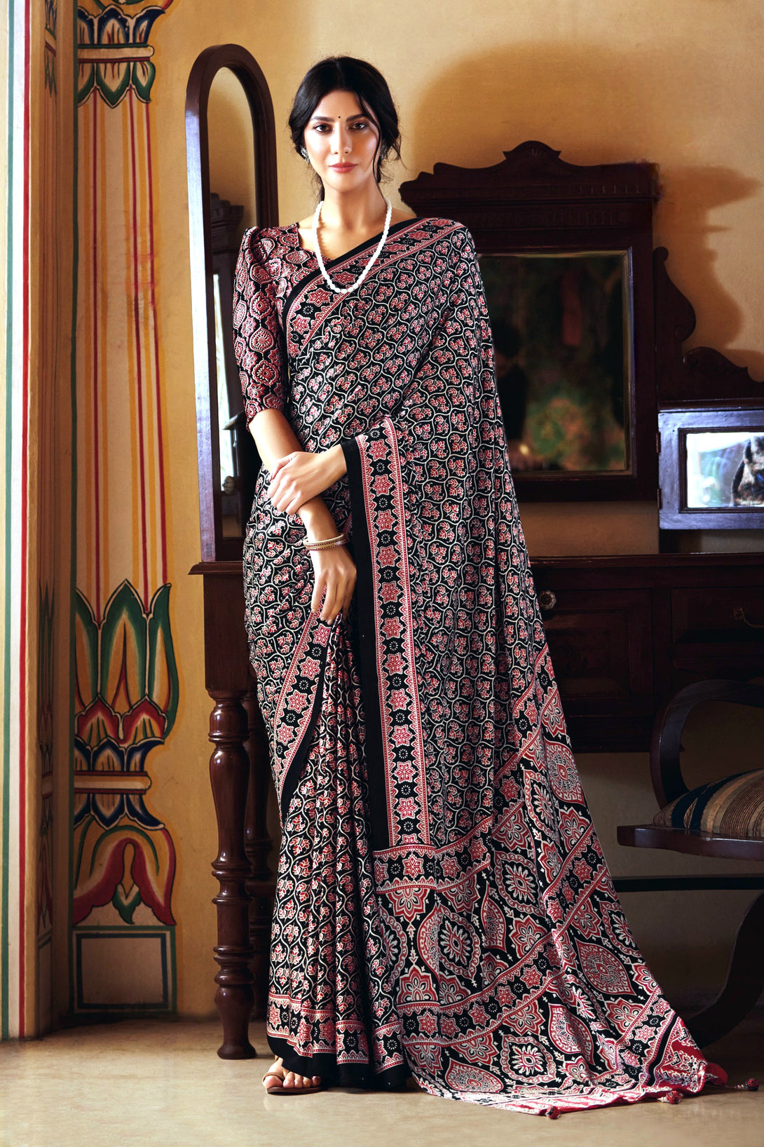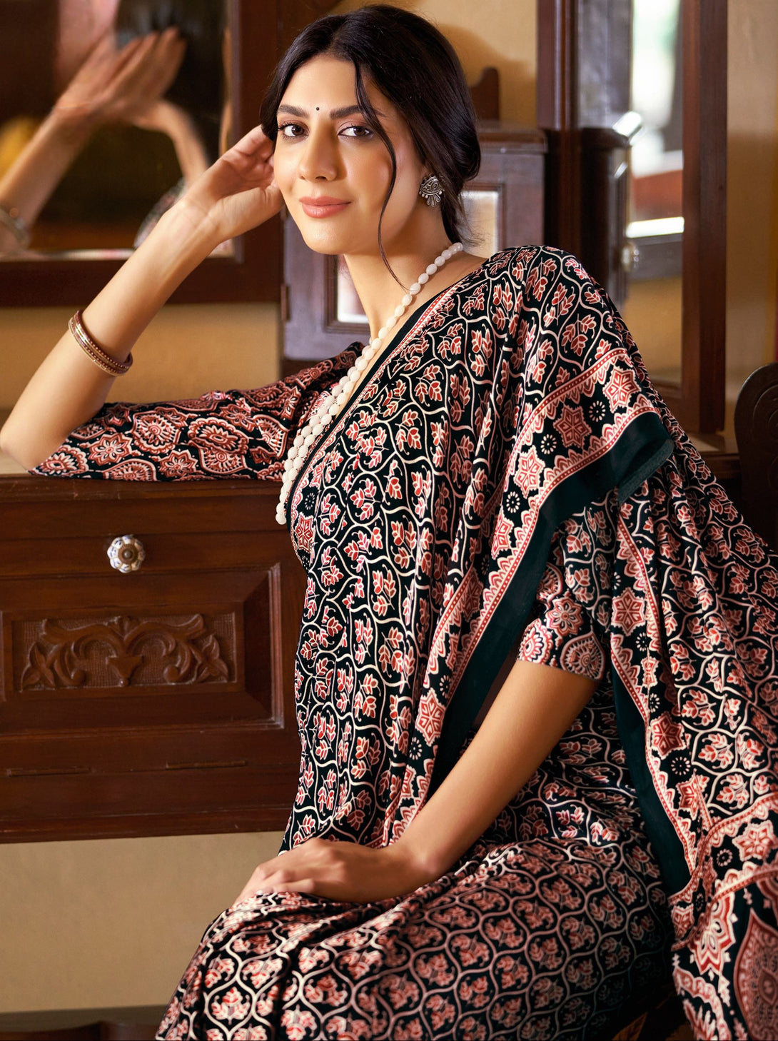 566004 अजरख प्रिंट क्रेप सिल्क साड़ी - काला