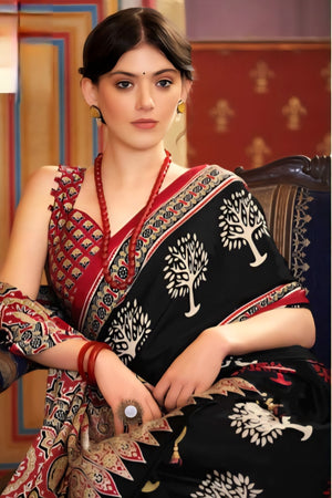 566008 अजरख प्रिंट क्रेप सिल्क साड़ी - काला
