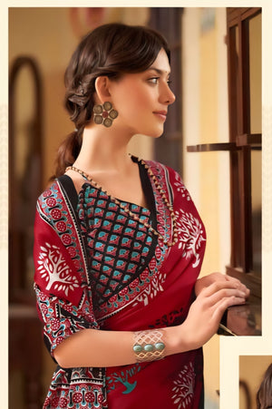 566008 पारंपरिक अजरख प्रिंट इटालियन क्रेप सिल्क साड़ी - लाल