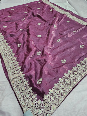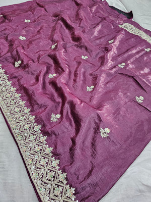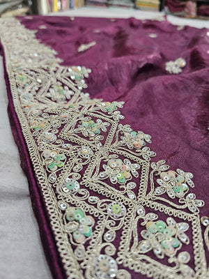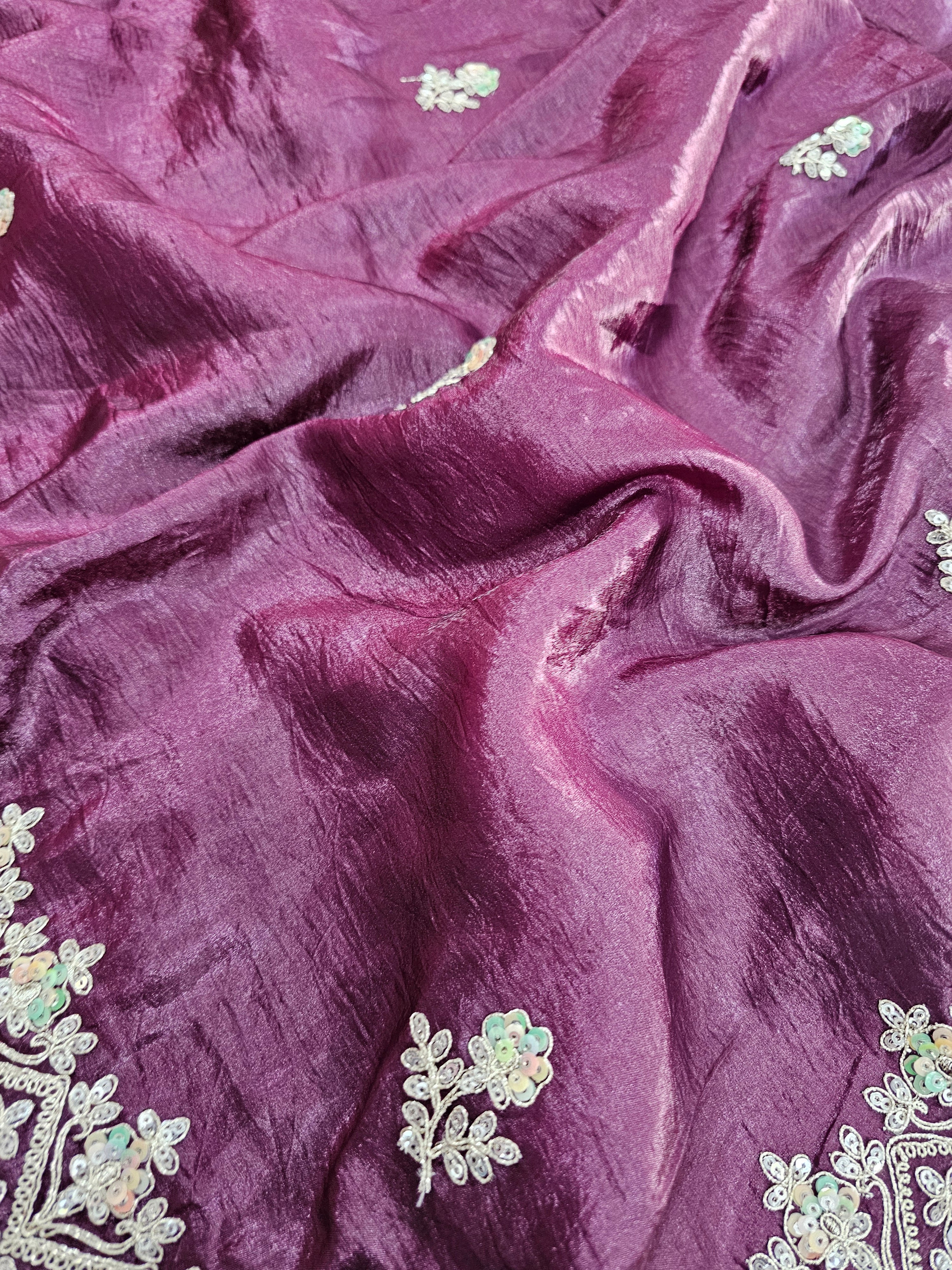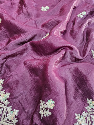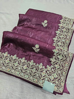 688004 डिज़ाइनर क्रश टिशू सिल्क साड़ी रंगीन सीक्वेंस वर्क के साथ - वाइन