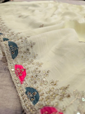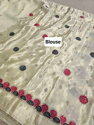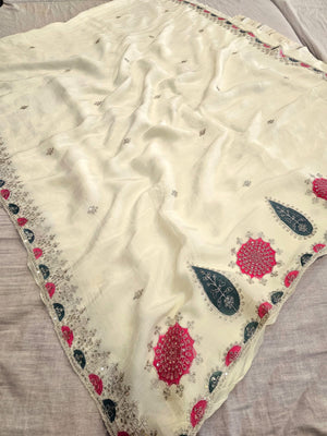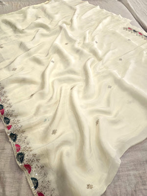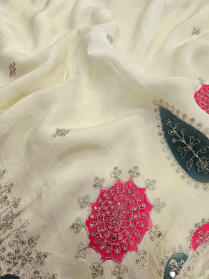 0666 प्रीमियम राजस्थानी शुद्ध चिनॉन सिल्क जल हैंडवर्क साड़ी