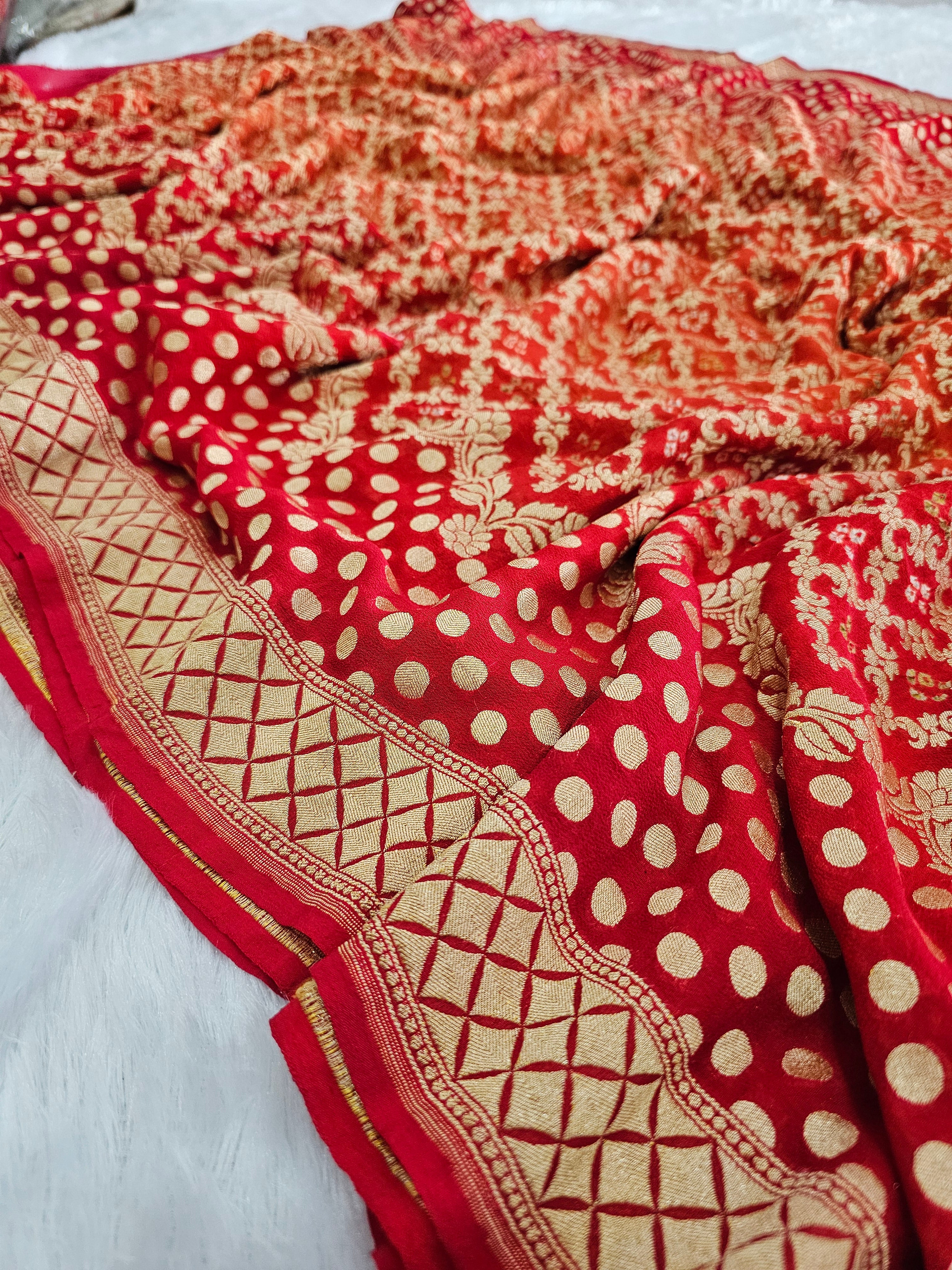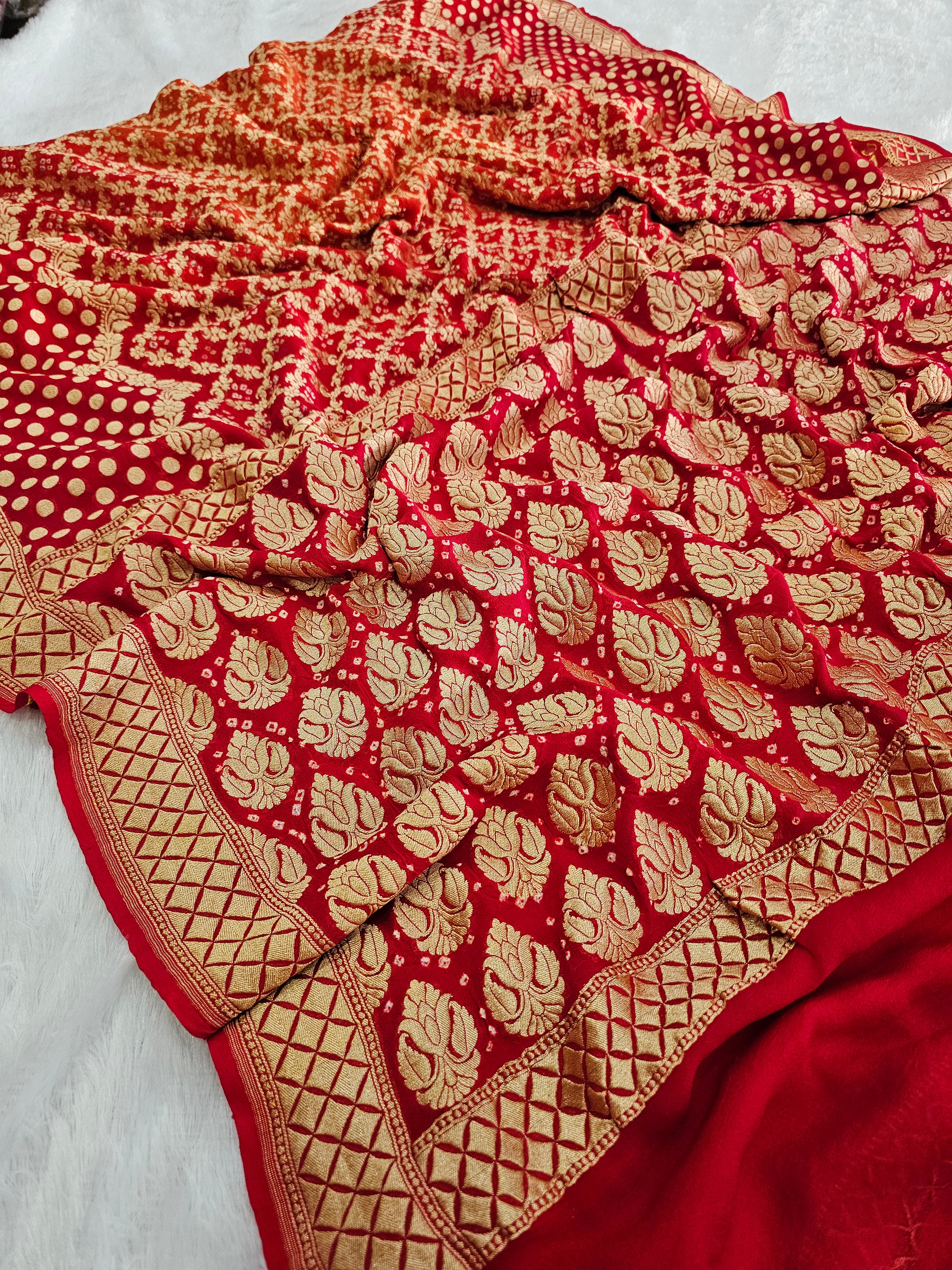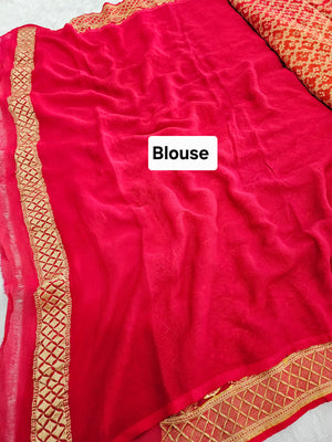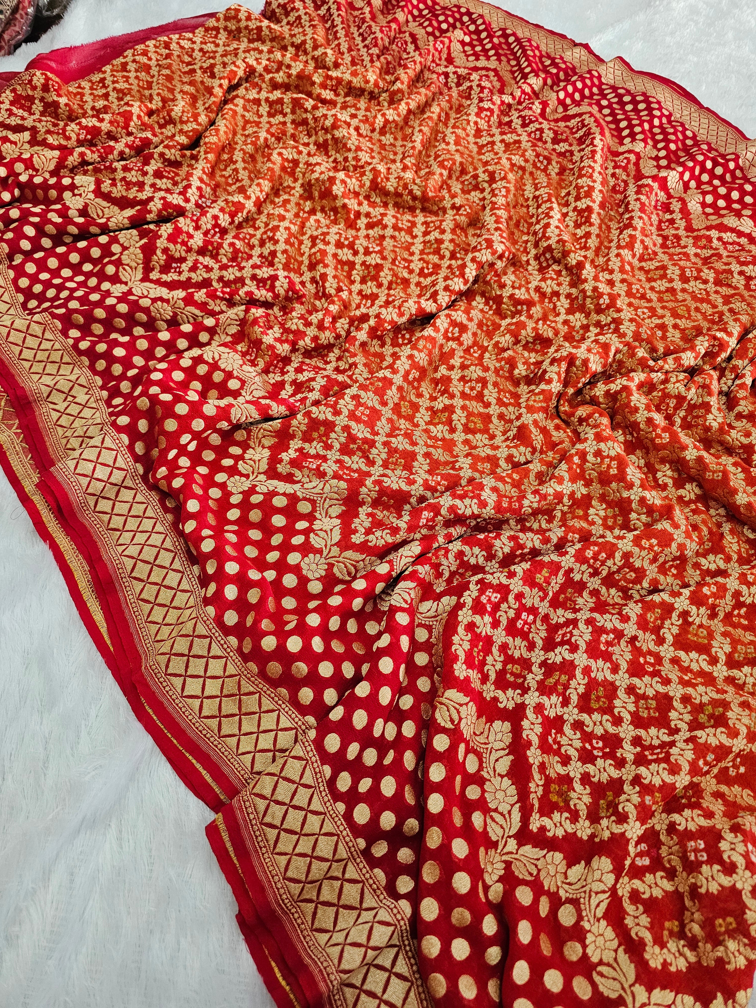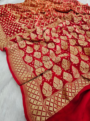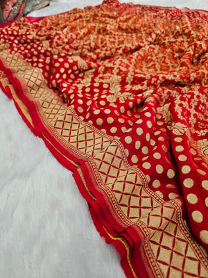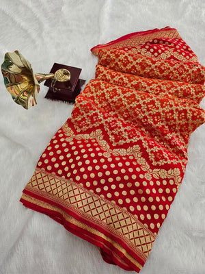 755007 Pure Georgette Red and Orange Rai Dana Bandhani Saree