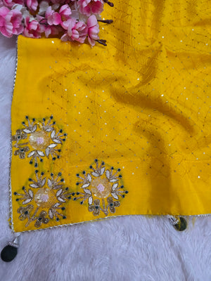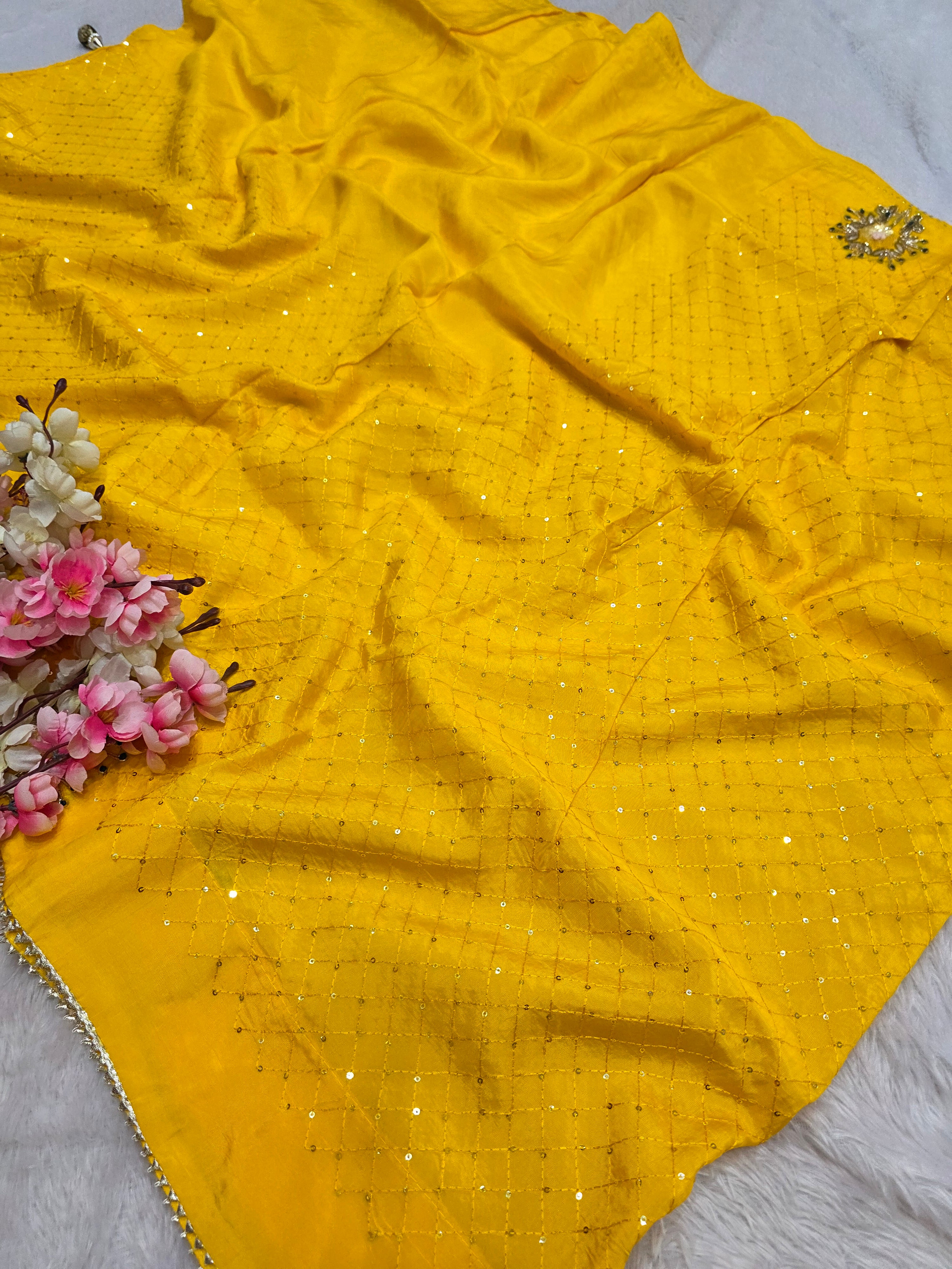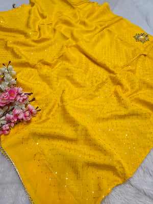 157005 शुद्ध रूसी सिल्क पार्टी वियर डिजाइनर साड़ी भारी कटदाना और अनुक्रम कार्य के साथ