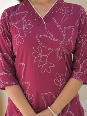 835004 Pure Cotton Straight Flower Print Cotton Kurti Set With Pant and Dupatta - Wine