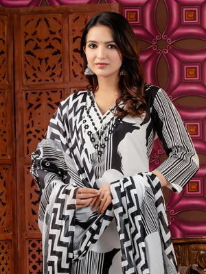 It has a V-neck, three-quarter sleeves, and flared hem and Comes with a Pant and Dupatta.
