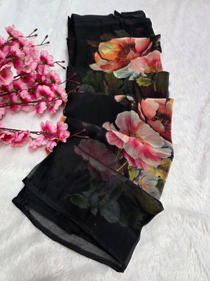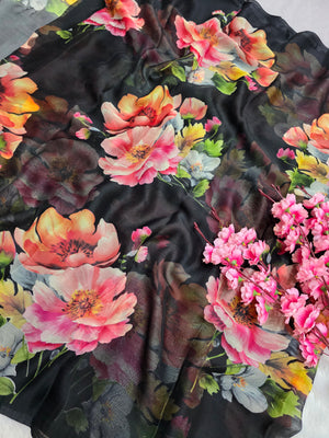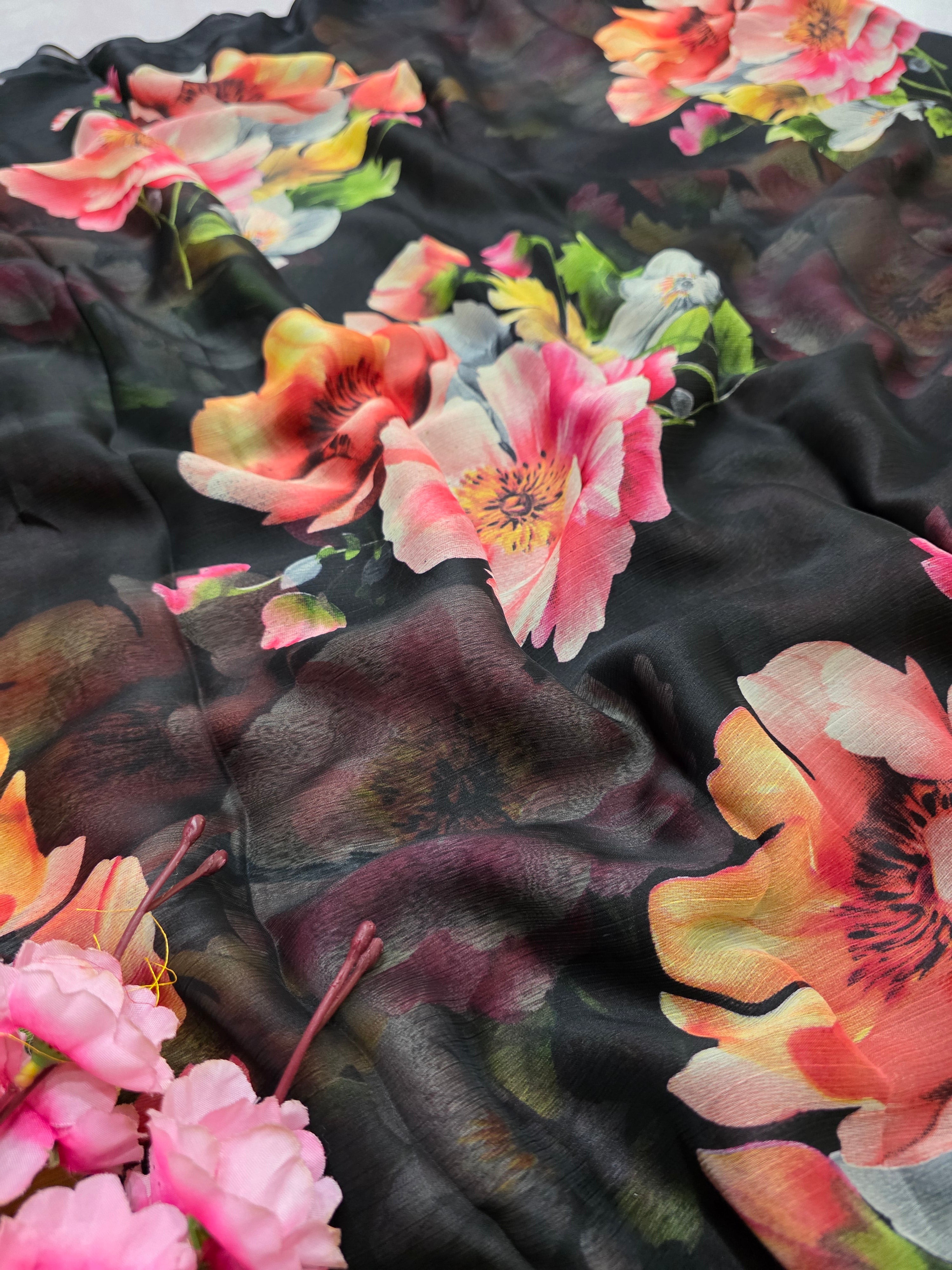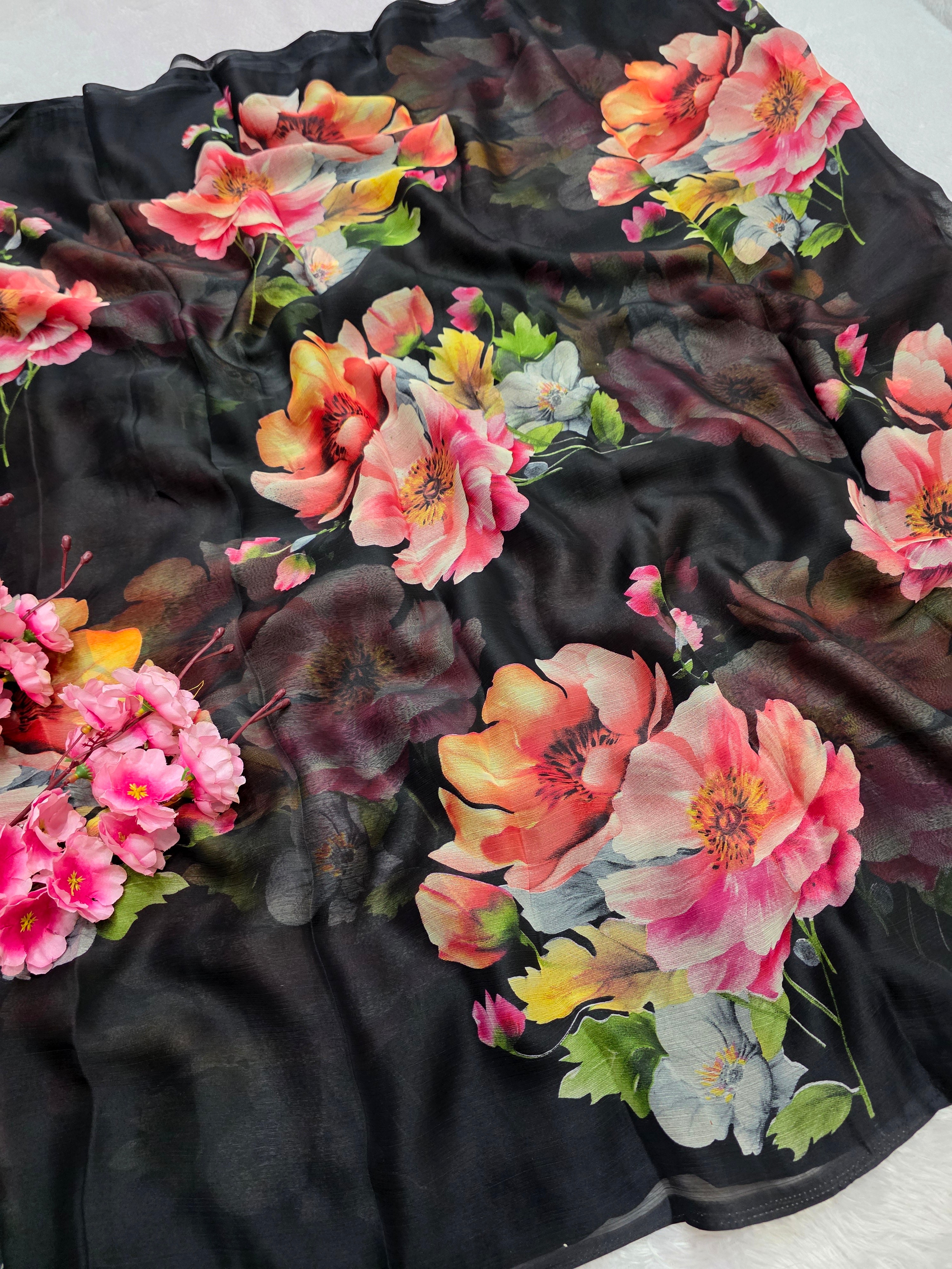 644001 एक्सक्लूसिव शिफॉन फ्लावर प्रिंट साड़ी - हरा