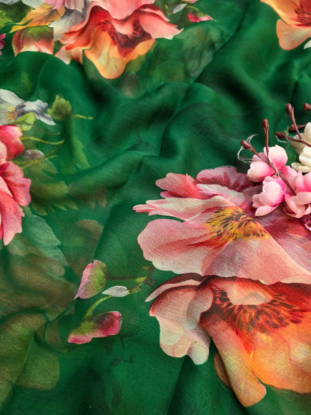 644001 एक्सक्लूसिव शिफॉन फ्लावर प्रिंट साड़ी - हरा