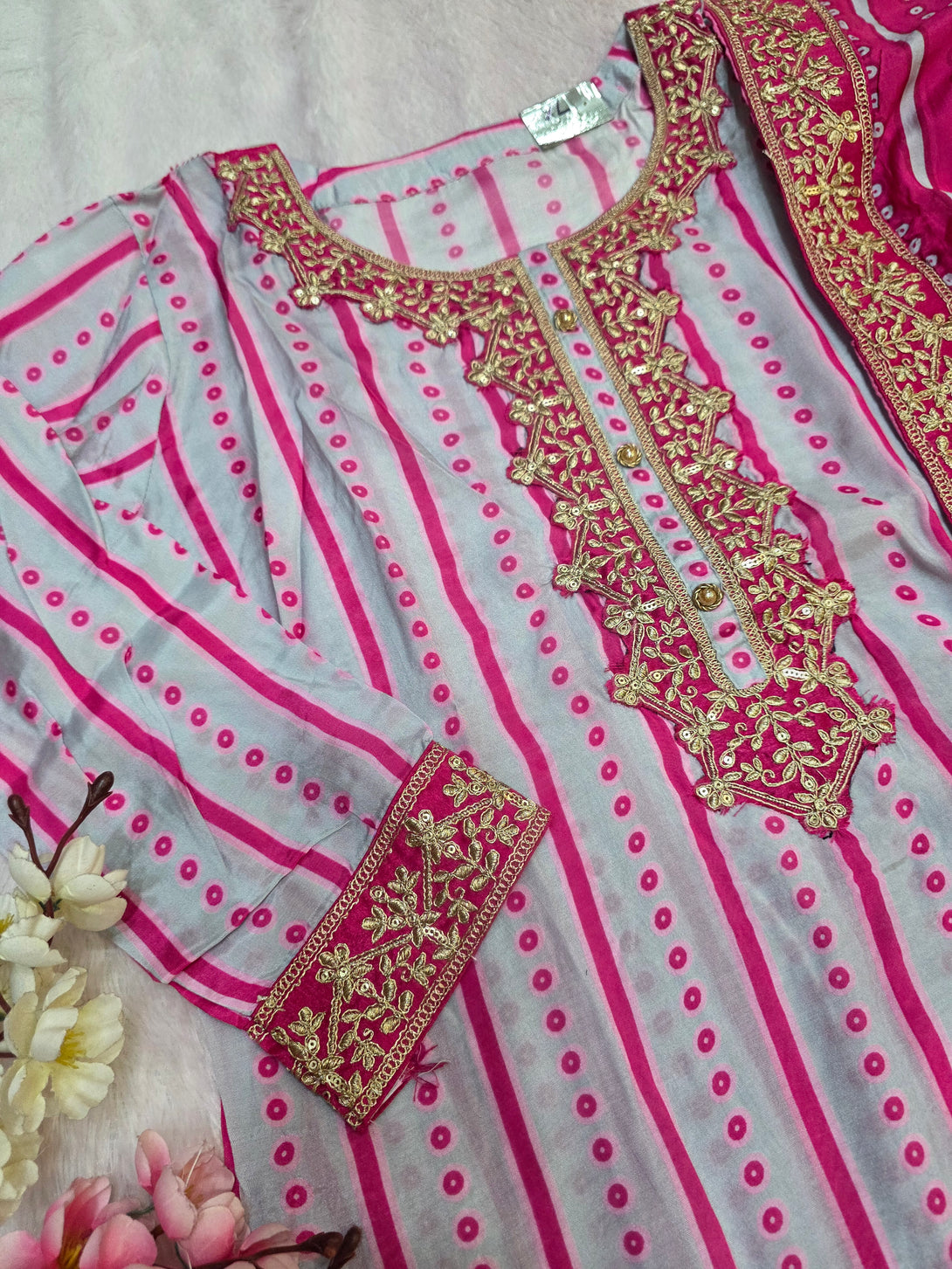 899005 Pure Maslin Silk Printed Semi Stitched Suit With Heavy Dupatta and Bottom Fabric