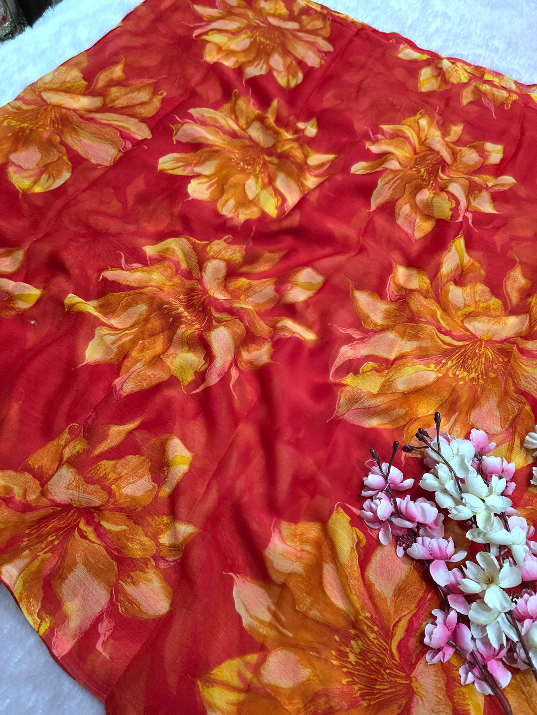 905001 Lightweight Elegant Semi Chiffon Flower Print Saree - Orange