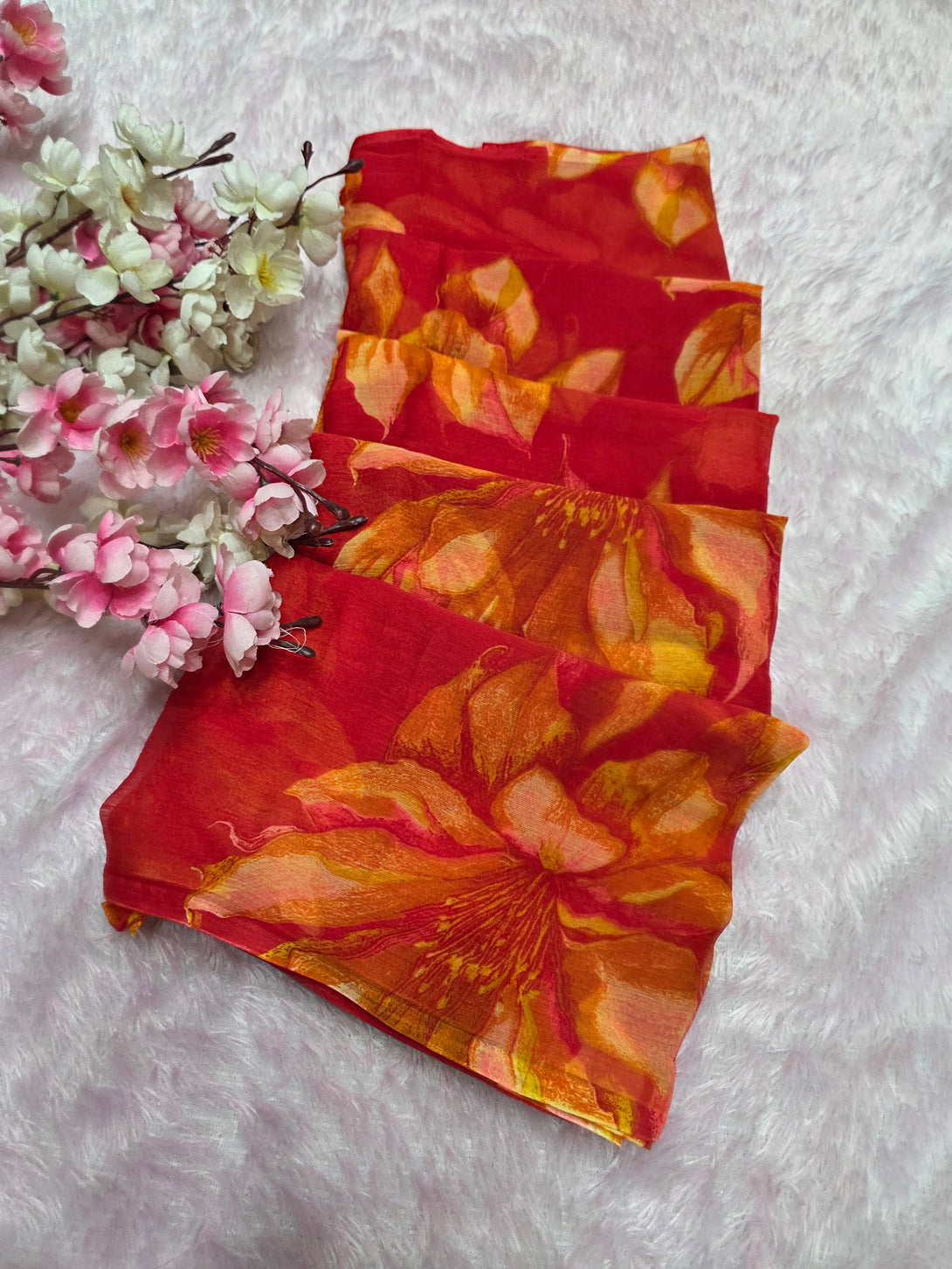Flower Print Semi-Chiffon Saree Without Blouse – Perfect Blend of Elegance and Comfort