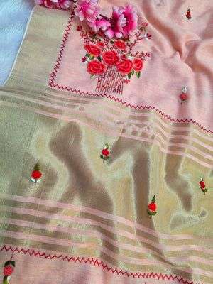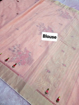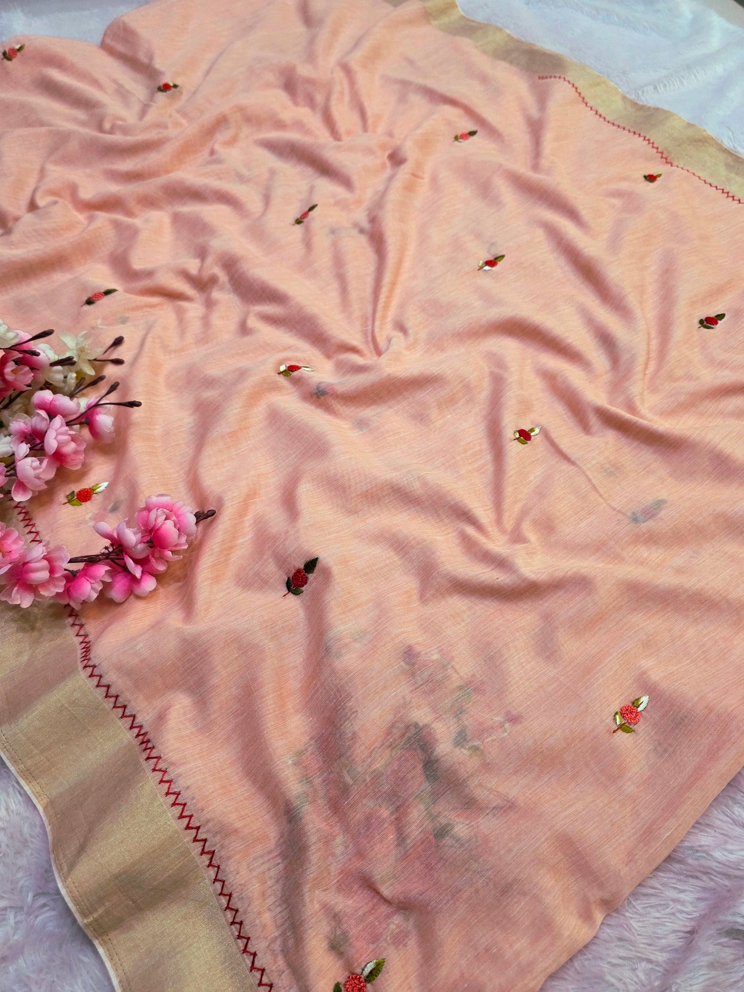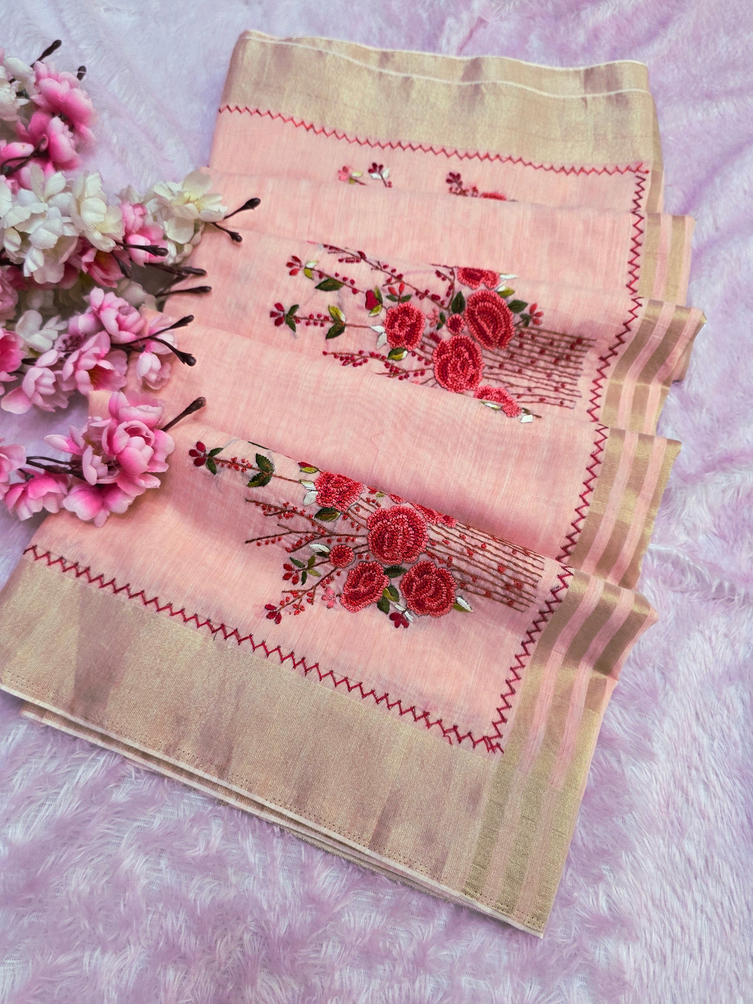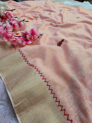 423005 कश्मीरी कढ़ाई के साथ शुद्ध लिनन साड़ी