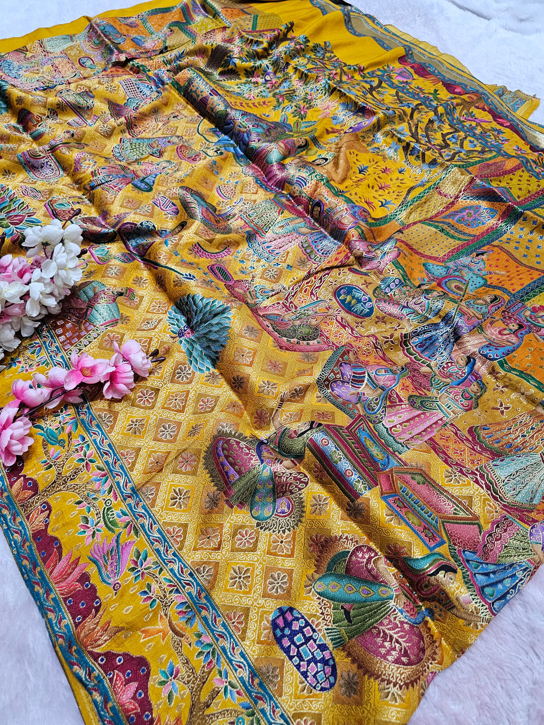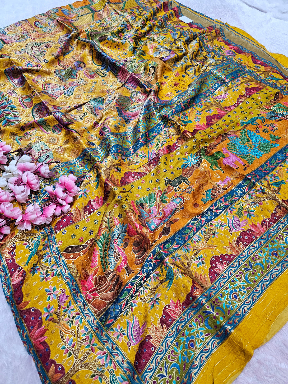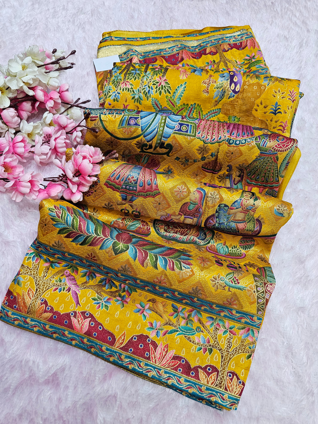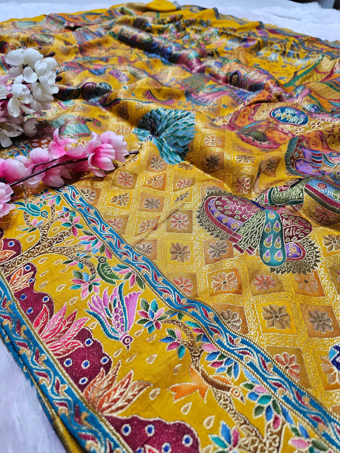 Experience timeless elegance with this Royal Kashmiri Pashmina Work Saree crafted in pure soft Dola silk. Paired with a 1 Mtr heavy zari work blouse (separate), this saree is perfect for weddings, parties, and festive occasions.