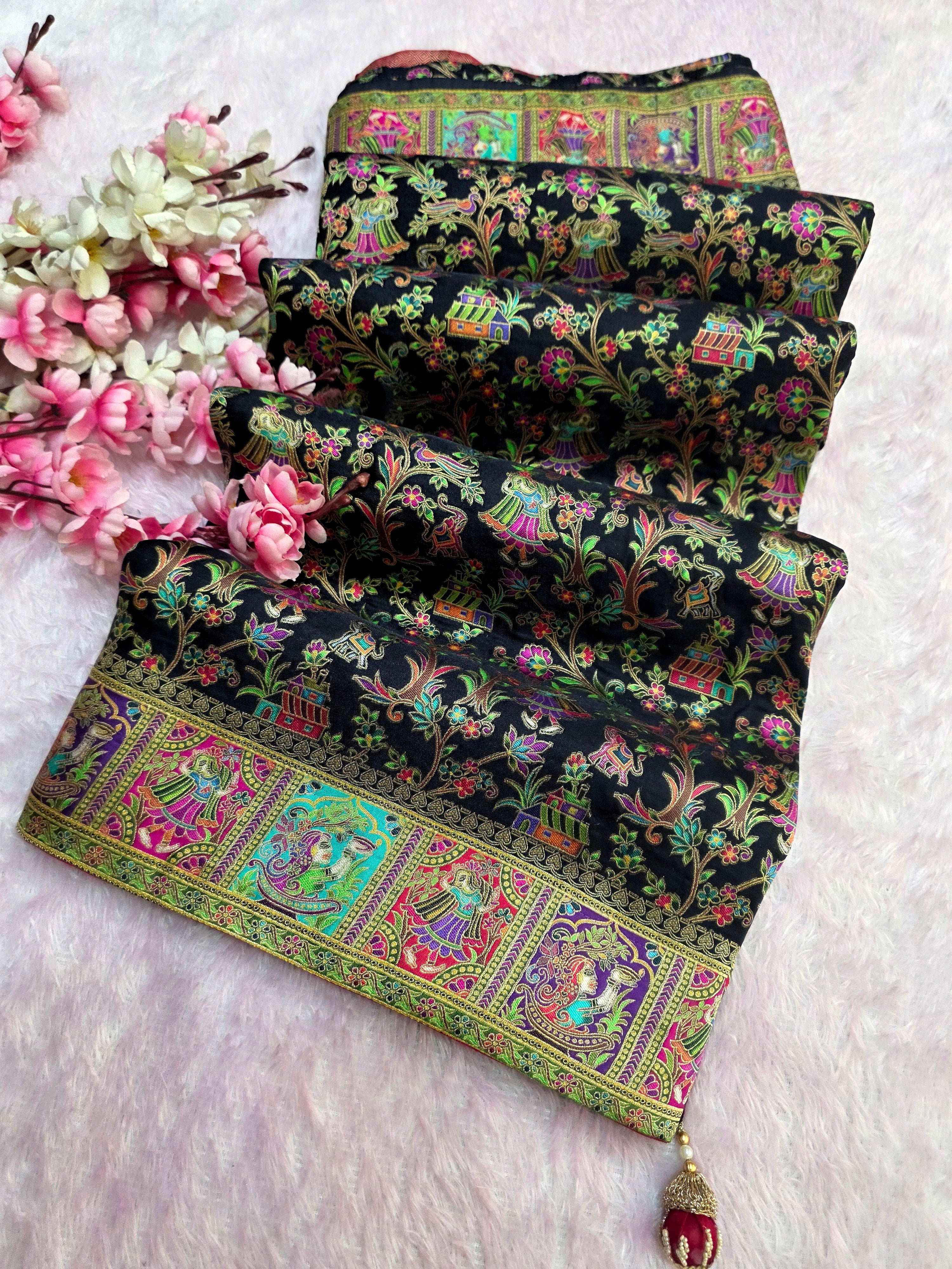 938002 Royal Kashmiri Natural Silk Black Saree with Heavy Blouse