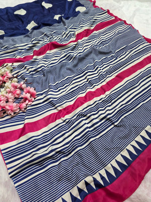 Elevate your ethnic look with this Ajrakh Print Satin Silk Saree – a blend of tradition and luxury. Made from premium satin silk, it features authentic Ajrakh block prints in rich, timeless patterns.