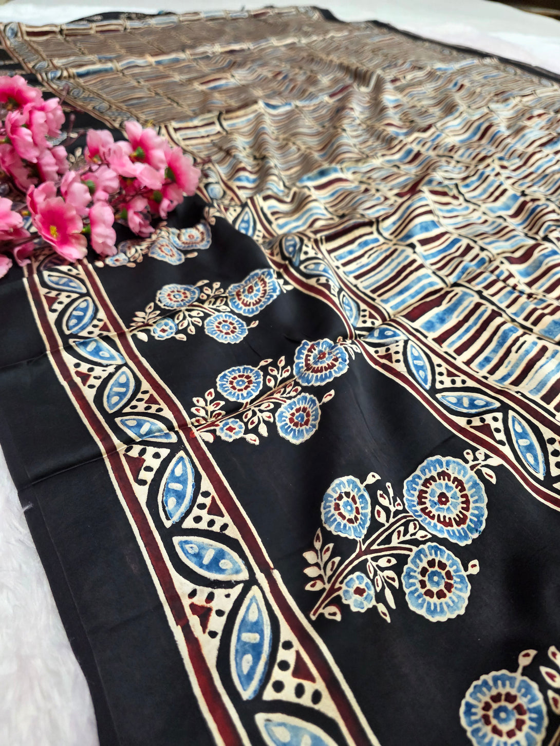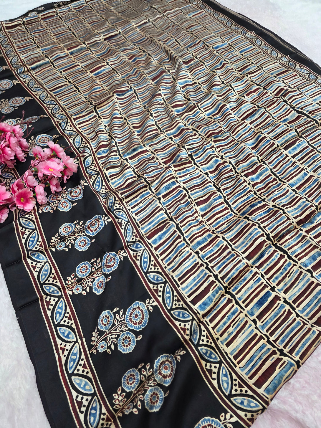 682002 ट्रेंडिंग अजरख प्रिंट इटैलियन क्रेप सिल्क साड़ी