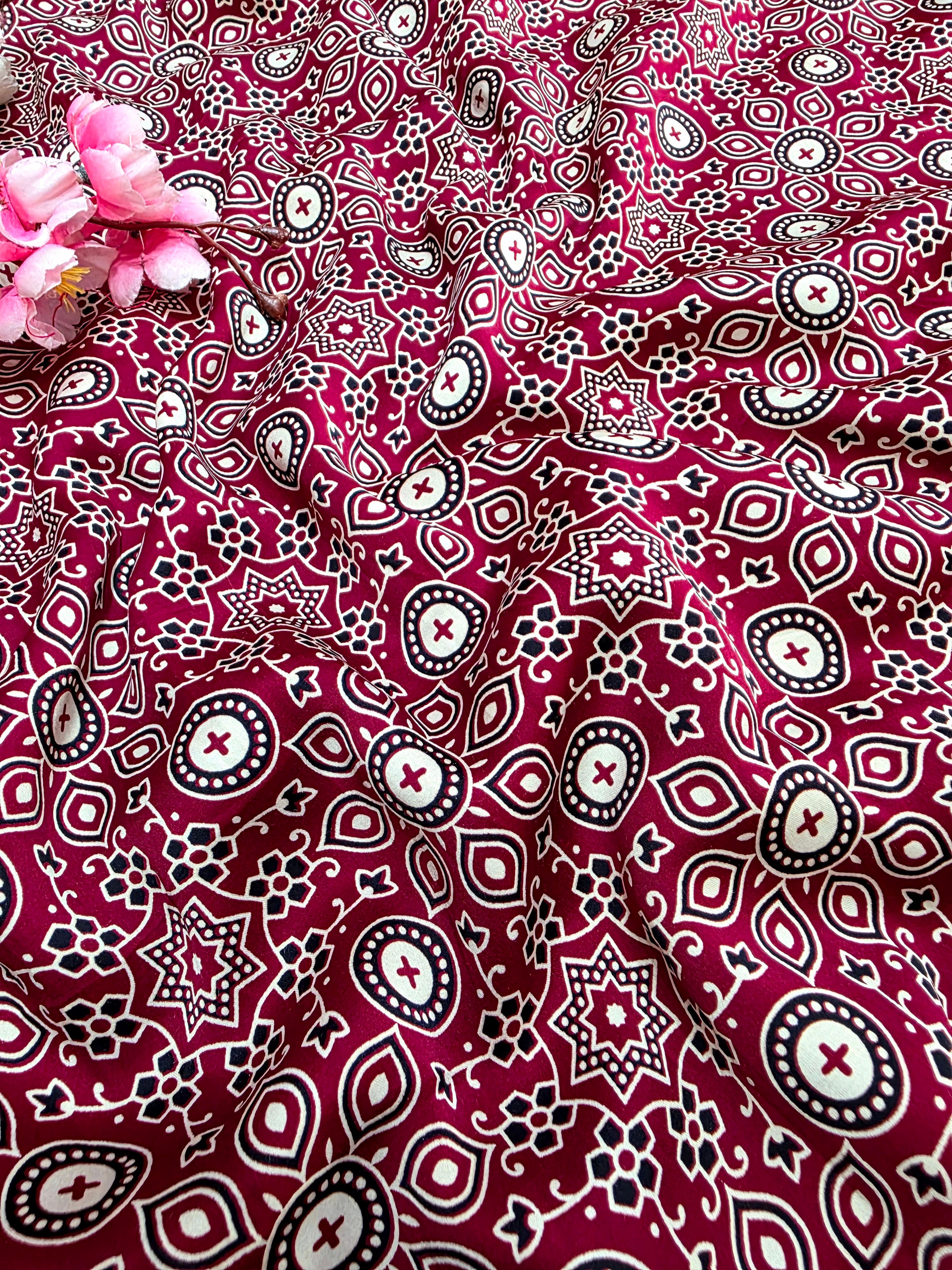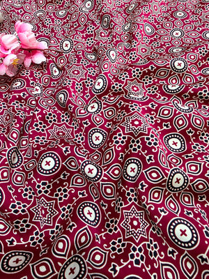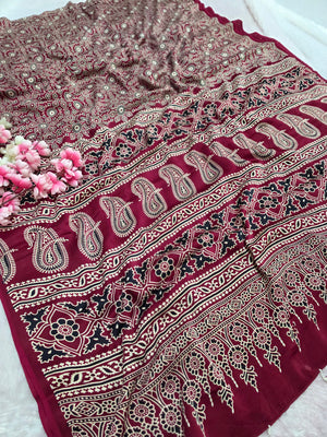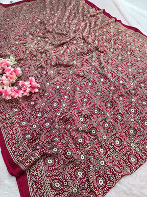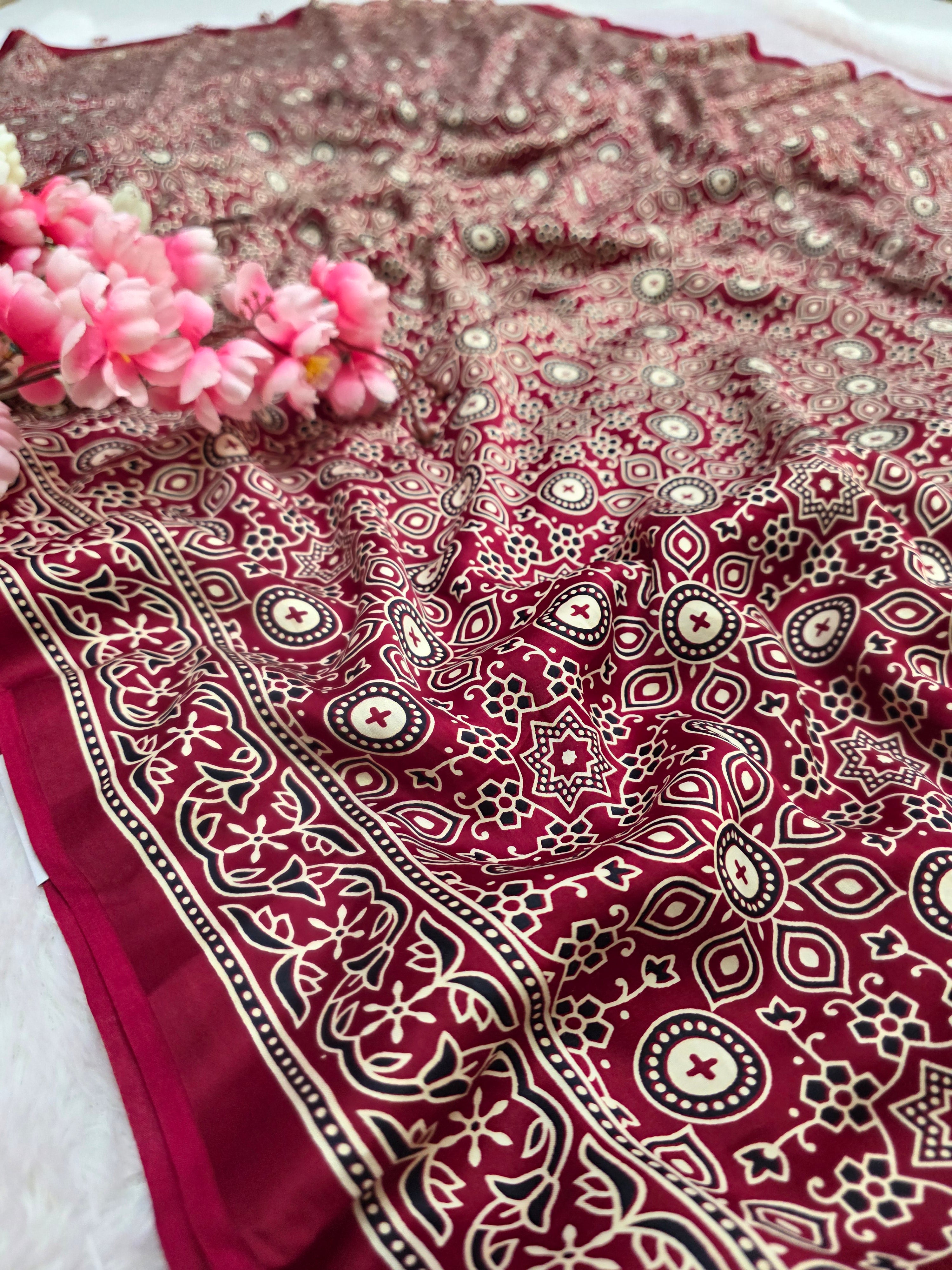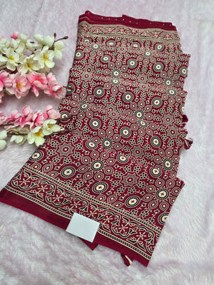 682002 ट्रेंडिंग अजरख प्रिंट इटैलियन क्रेप सिल्क साड़ी
