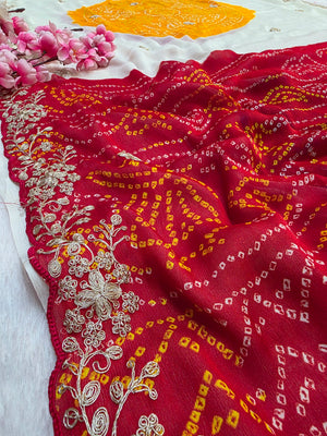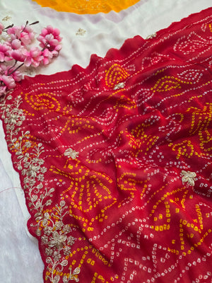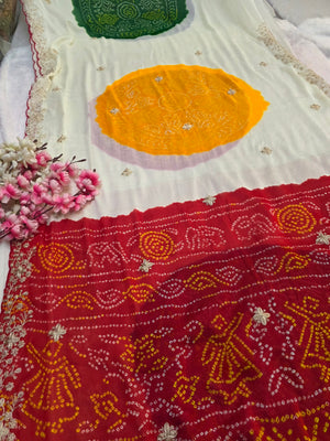 967003 Traditional Bandhani Multicolor Ghewar Georgette Saree with Pitta Work