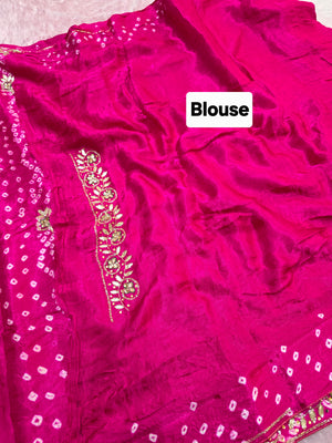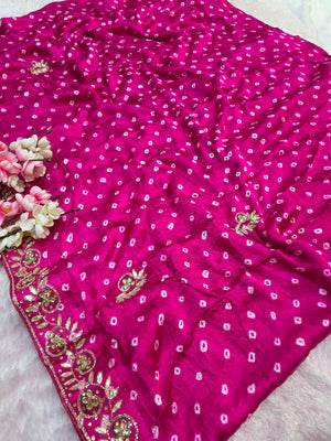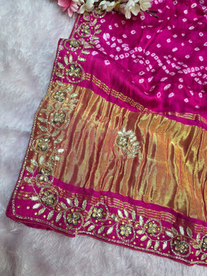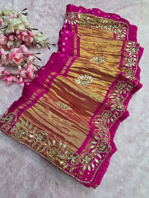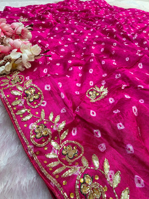 967004 Traditional Semi Gajji Silk Bandhani Saree with Hand Gota Patti Work - Pink