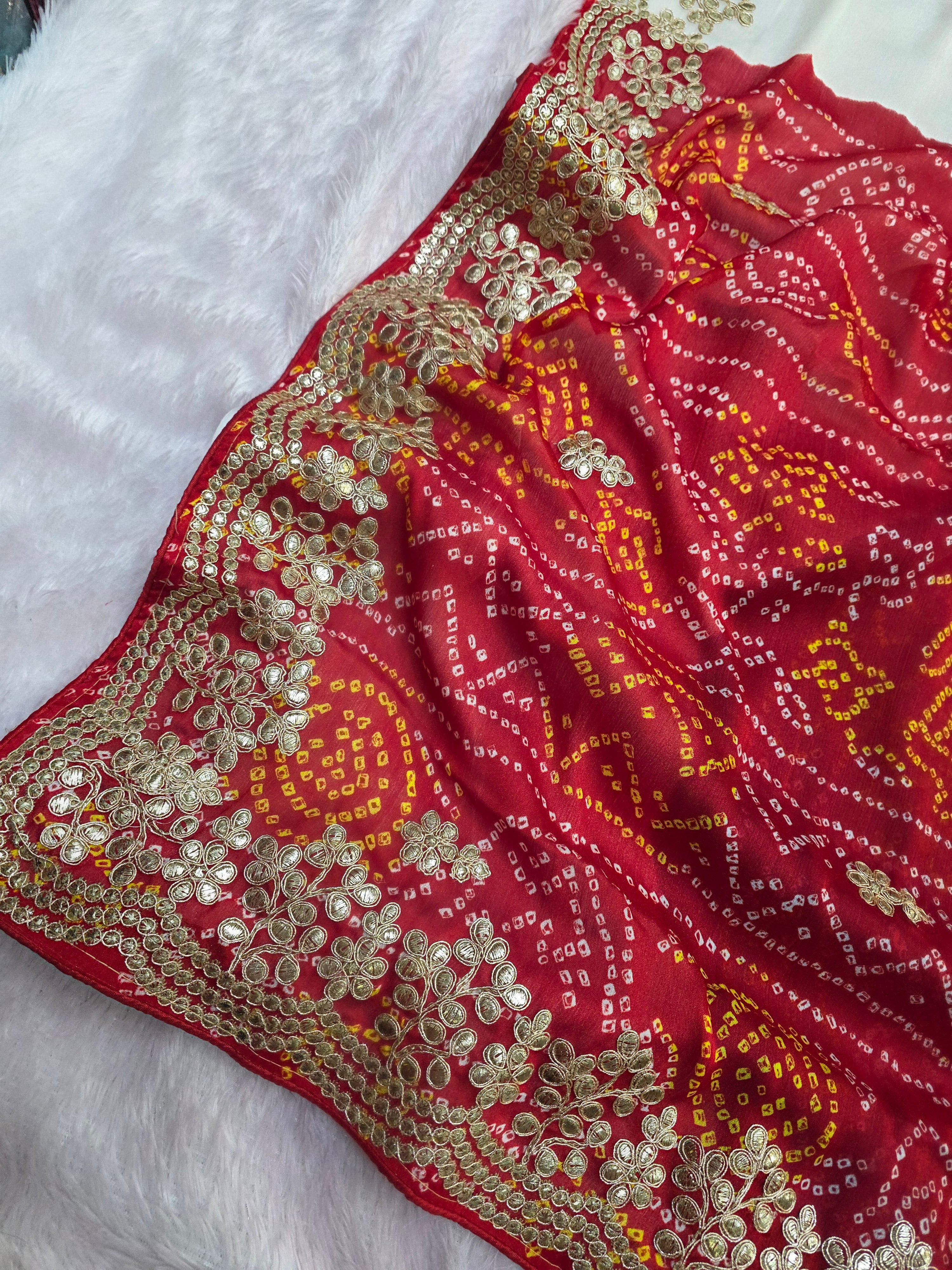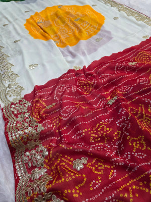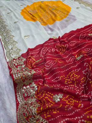 967005 Traditional Bandhani Ghewar Georgette Saree with Gotapatti Work - White