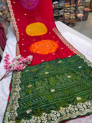 967005 Traditional Bandhani Ghewar Georgette Saree with Gotapatti Work - Red