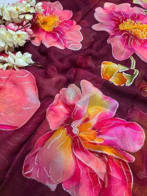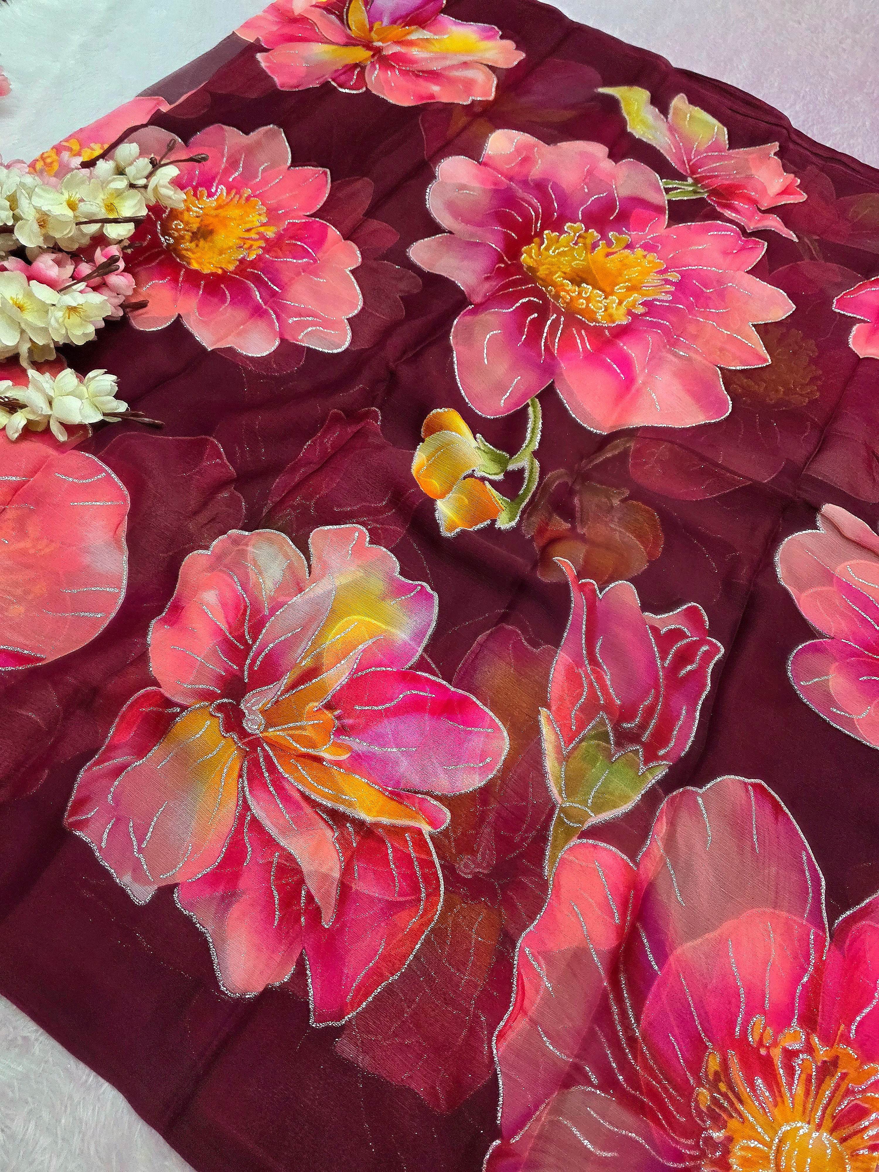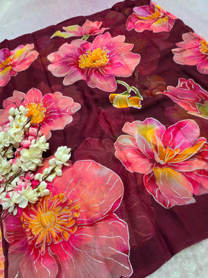 644001 एक्सक्लूसिव शिफॉन फ्लावर प्रिंट साड़ी - हरा