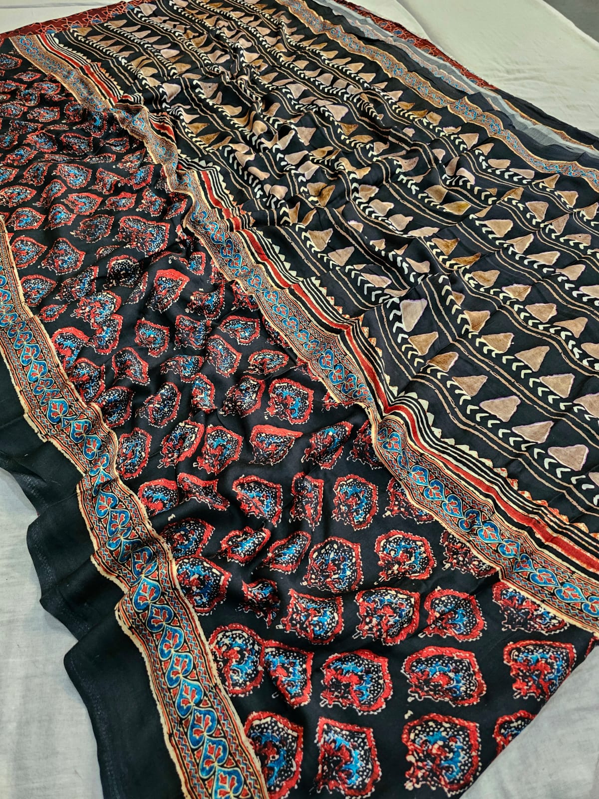 C71008 एक्सक्लूसिव अजरख प्रिंटेड सॉफ्ट मॉडल सिल्क लगड़ी पल्लू साड़ी