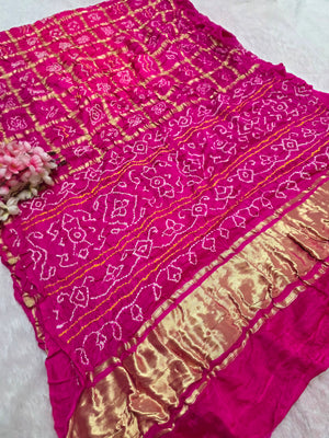 ब्लाउज के साथ पूरी साड़ी पर स्वर्ण बुनाई के साथ विशेष बांधनी घाटचोला साड़ी।