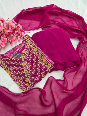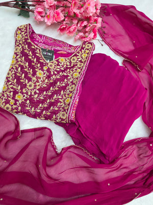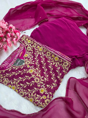 - प्रमुखता से दिखाना : प्रीमियम चिनॉन सिल्क प्रिंटेड गाउन गर्दन और भारी बेल्ट पर कटदाना काम के साथ