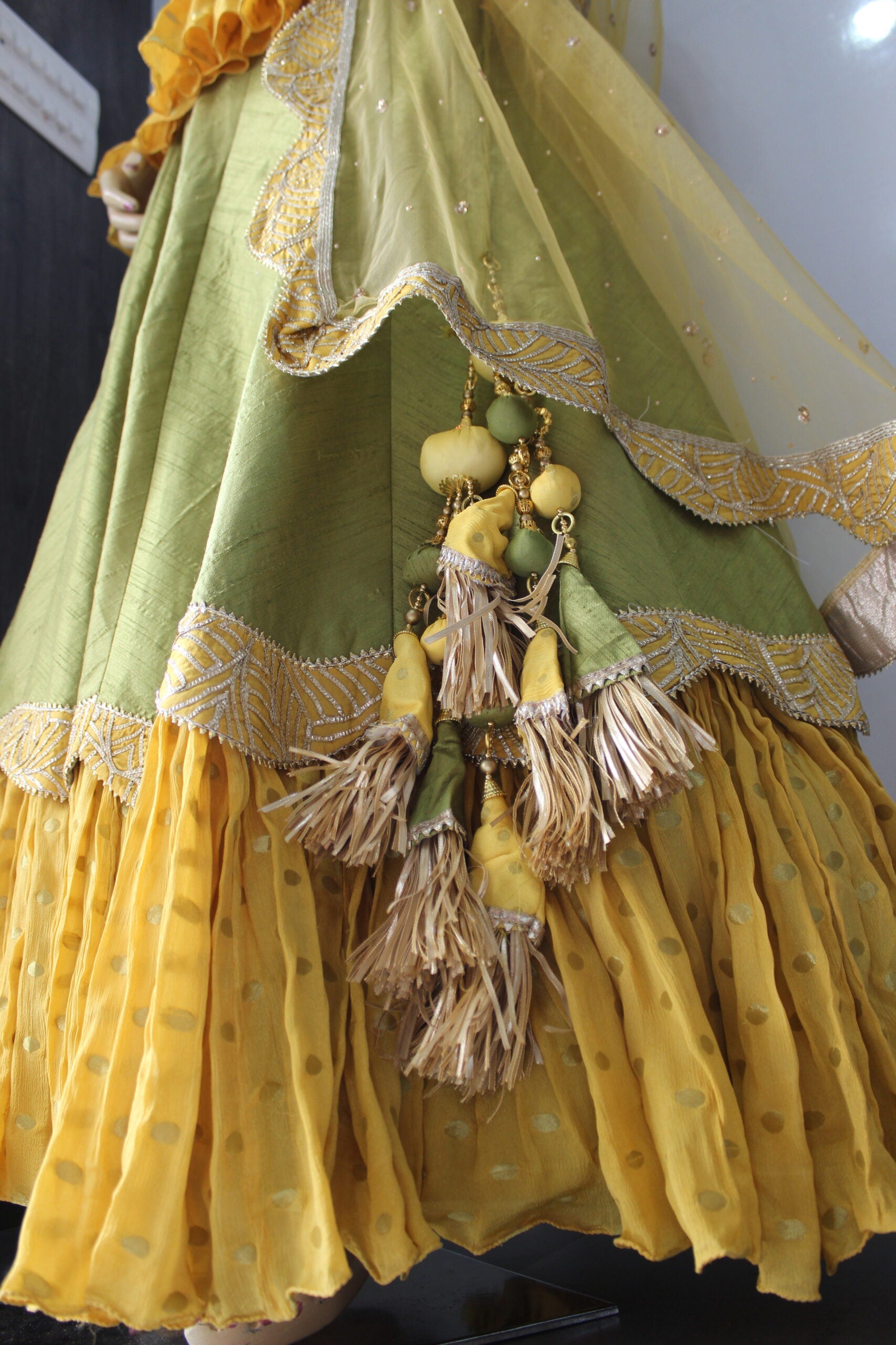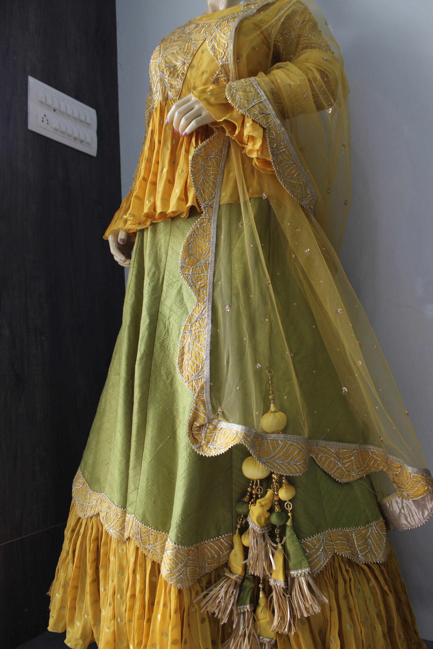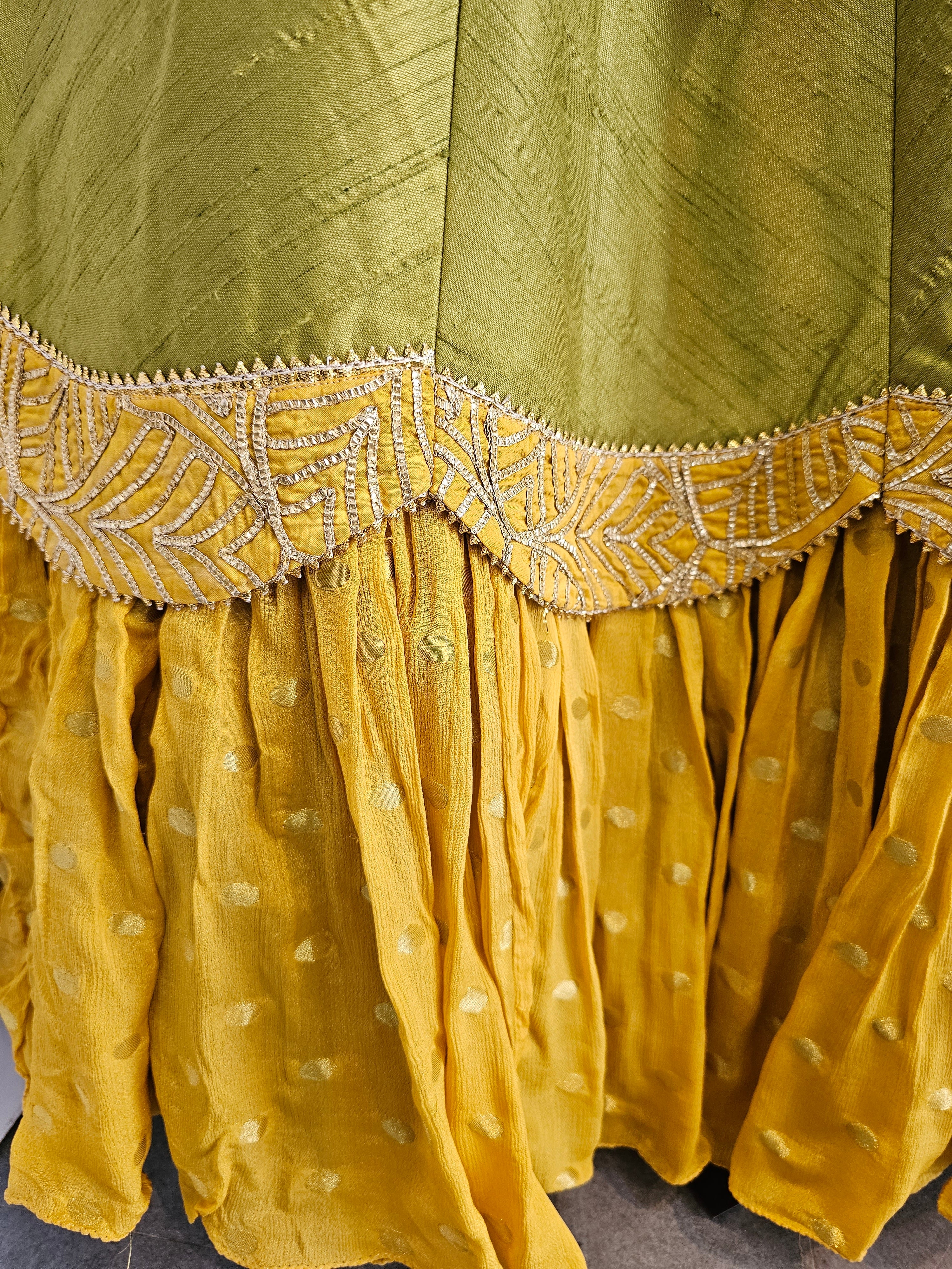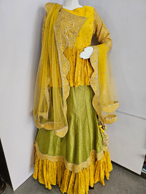 डिजाइनर हरा पीला पेप्लम स्टाइल प्रीमियम लहंगा
