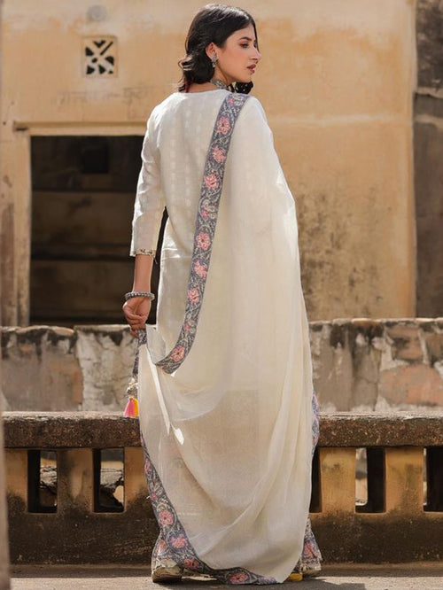 गोटा वर्क के साथ उत्तम दर्जे के रंगों में शरारा के साथ भव्य आइवरी शॉट कुर्ता, आइवरी रंग के मुद्रित बॉर्डर वाले मुलायम कॉटन दुपट्टे के साथ स्टाइल किया गया है।