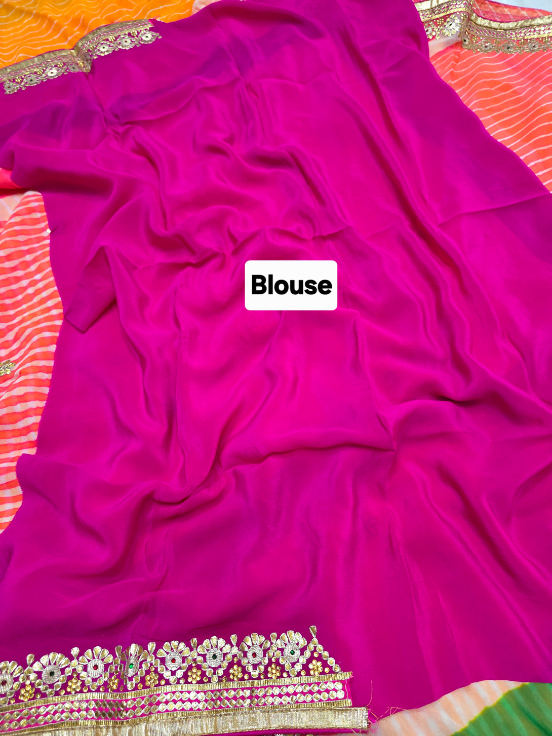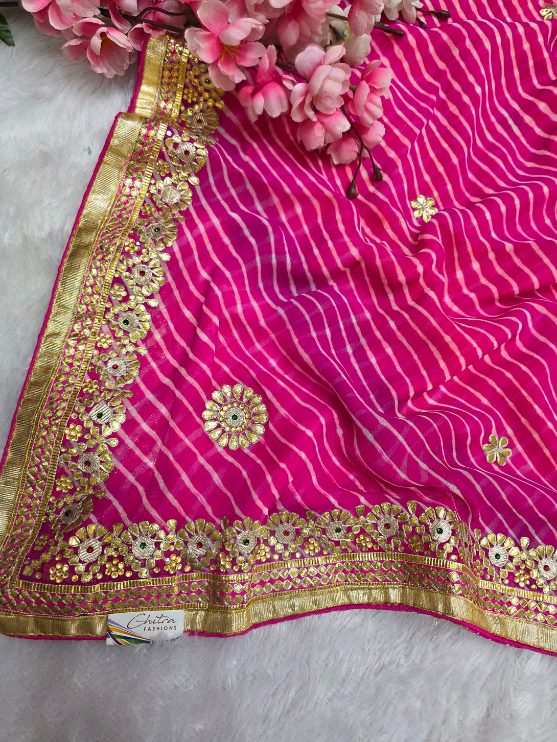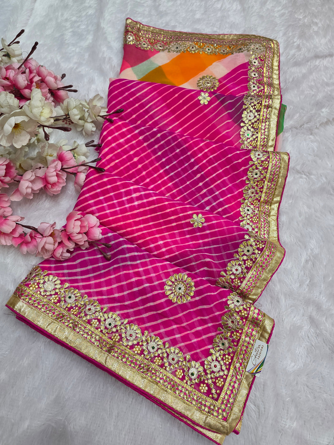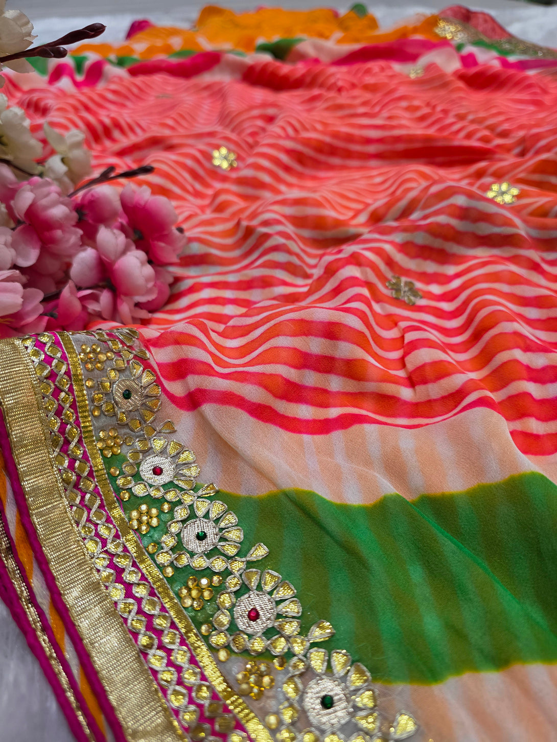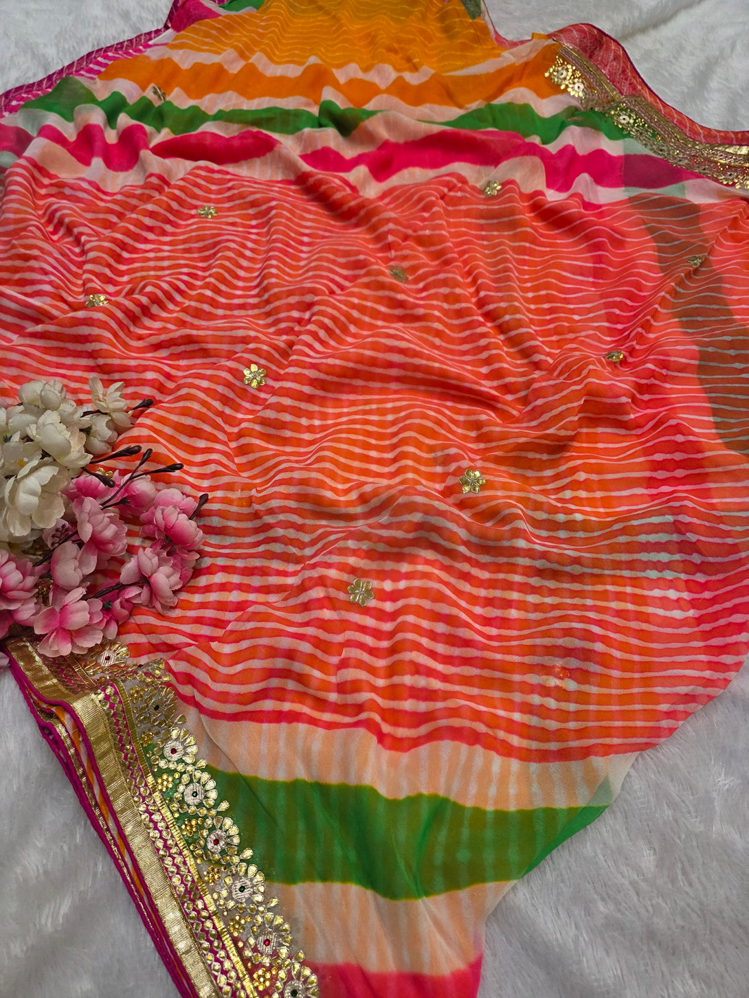 सुंदर गोटापट्टी वर्क के साथ शुद्ध राजस्थानी ओजरिया जॉर्जेट पचरंगी लहरिया साड़ी