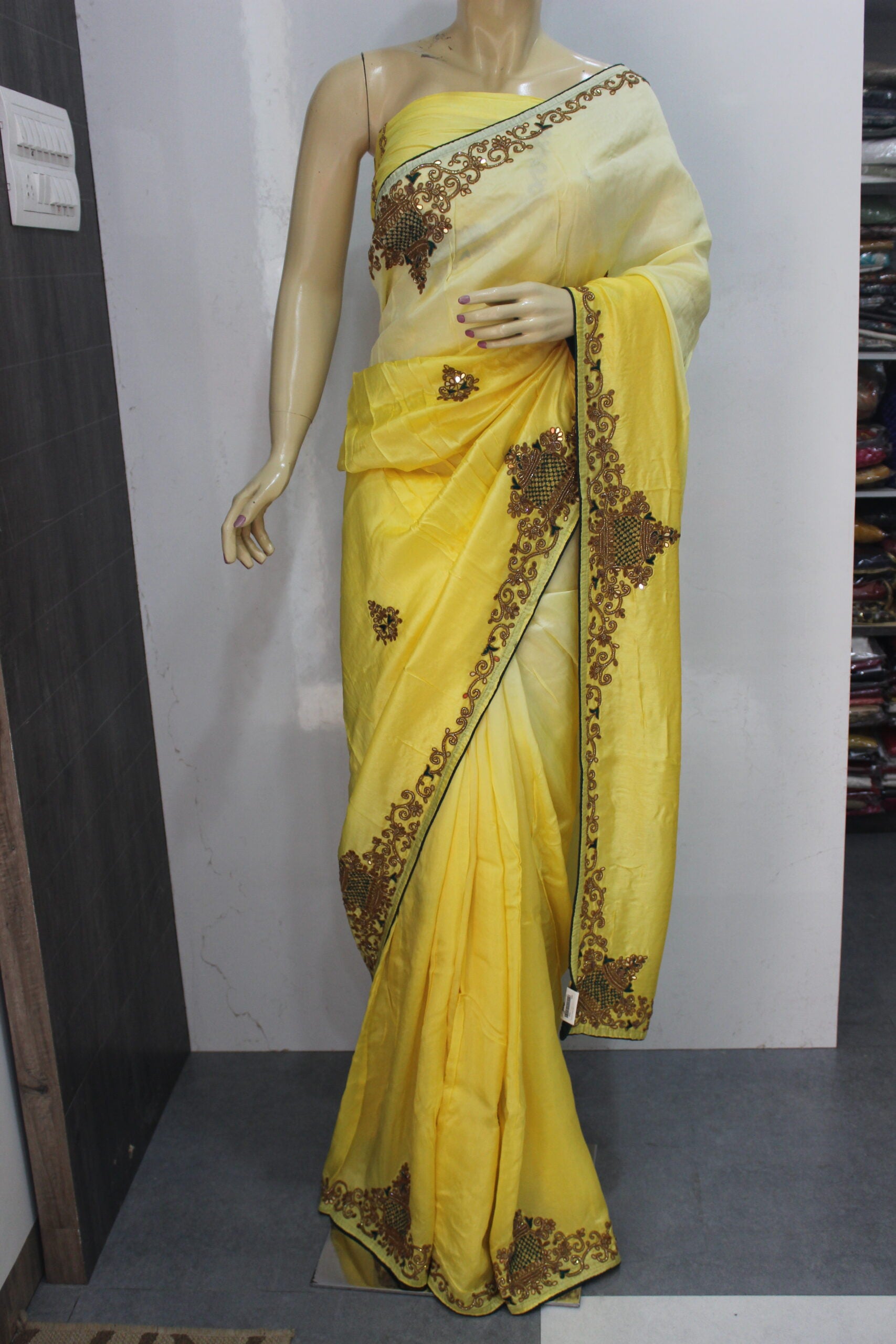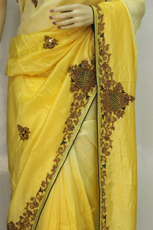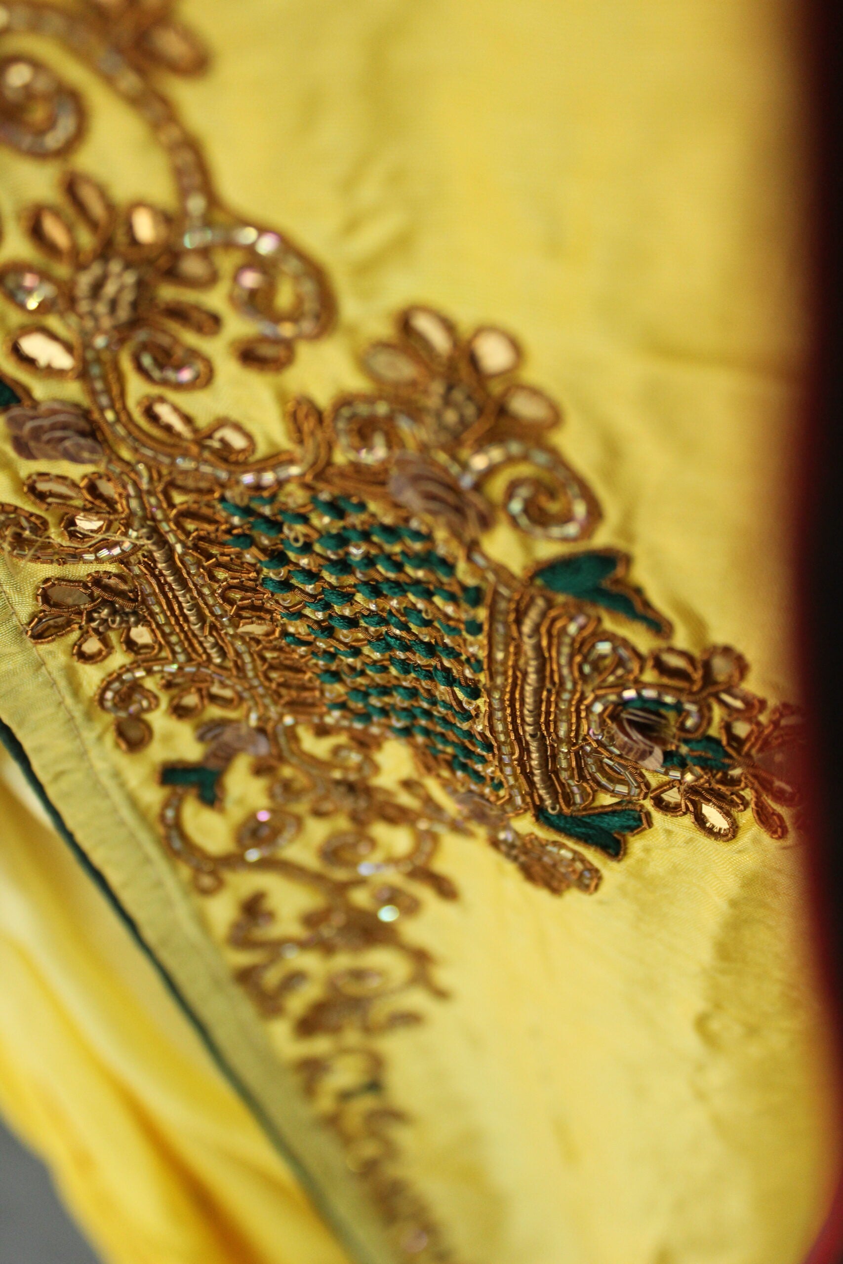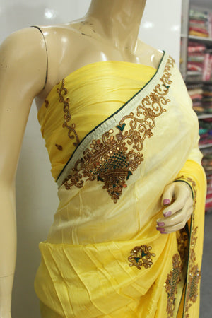 - प्राचीन जरदोजी रजवाड़ी शैली के काम के साथ पीले रंग की डिजाइनर साड़ी