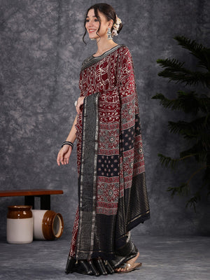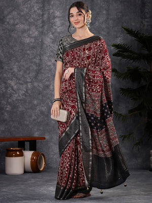 100601 Beautiful Pure Maslin Silk Traditional Print Saree with Zari Weaving Border and Heavy Brocket Blouse