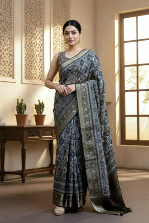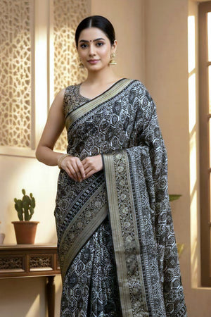 100604 Beautiful Pure Maslin Silk Traditional Print Saree with Zari Weaving Border and Heavy Brocket Blouse