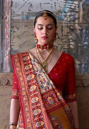 100706 Premium Patola Print Silk Saree With Gold Print - Cream
